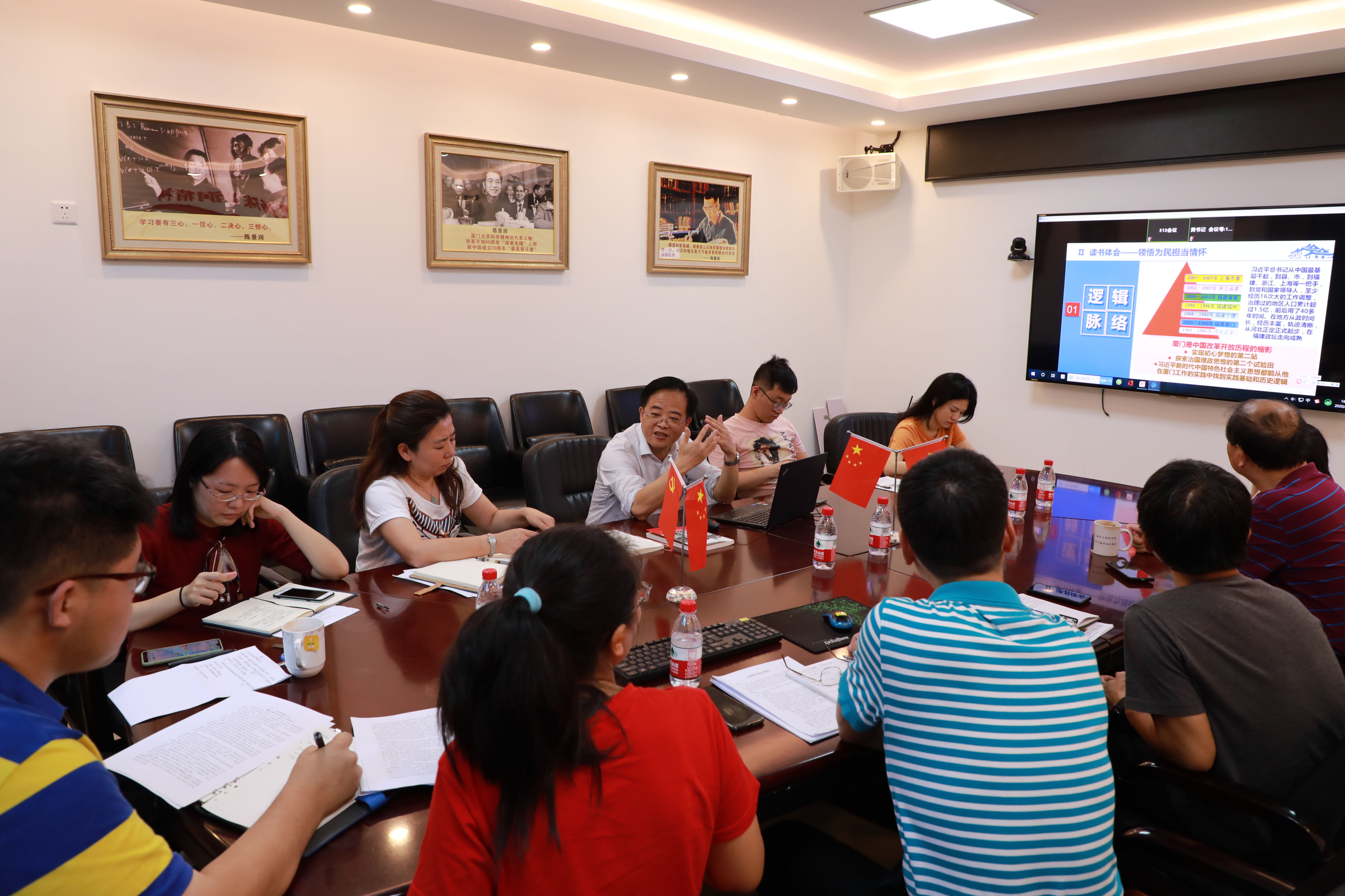 随后,支部书记吴纲民、副书记陈李媛和支委黄晨龙、欧阳雯思结合思想和工作实际与大家分享了各自对《习近平在福建》访谈录的学习心得,与会其他党员也相互交流了读书体会。大家一致表示,作为党员,要加强理论武装,认真领悟习近平总书记在福建工作时的一系列具有前瞻性、开创性、战略性的理念创新和重大实践,深刻领会习近平新时代中国特色社会主义思想的精髓要义,自觉提升党性修养和政治能力,进一步增强“四个意识”、坚定“四个自信”、做到“两个维护”,进一步发挥模范带头作用,学以致用,担当进取,努力在推动学院内涵式发展和学校“双一流”建设的实践中锤炼新本领、展现新作为、争创新业绩。