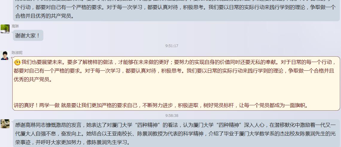 陈淑铌老师在此期间与发言同学进行了互动。她讲到要多了解榜样的做法,才能够在未来做的更好;要努力的实现自身的价值同时还要无私地奉献。对于每一次学习,都要认真对待,积极思考。要以日常的实际行动来践行学到的理论,争做优秀共产党员。“两学一做”就是要让我们更加严格地要求自己,积极进取,树好党员标杆,让每一个党员都成为一面旗帜。