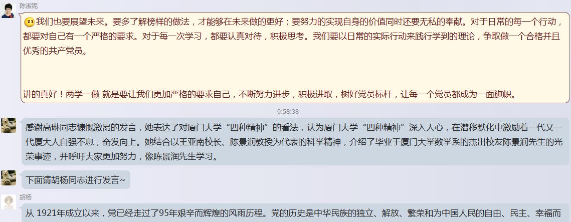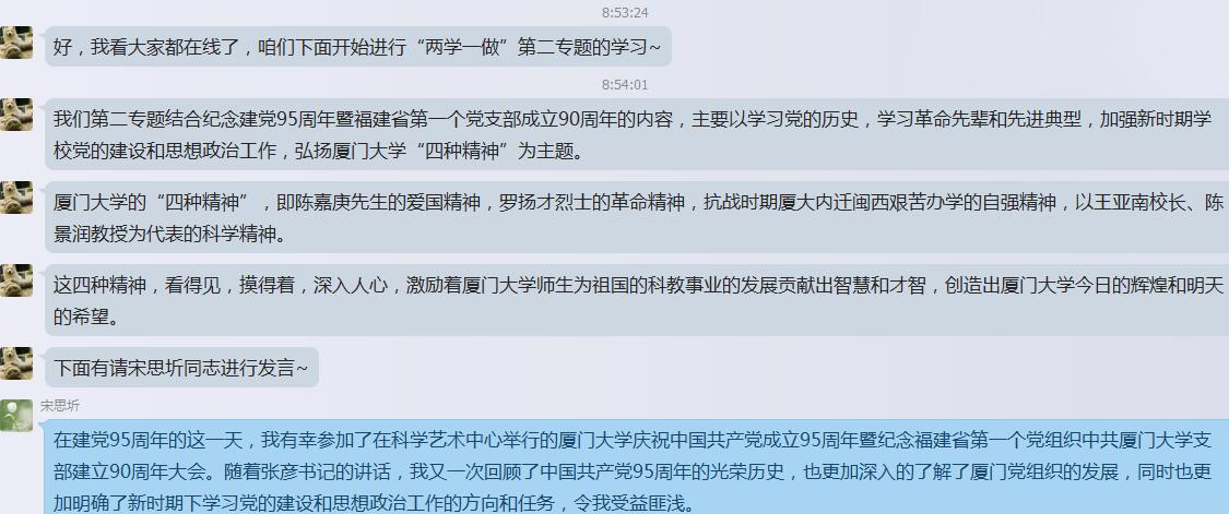 随后,与会党员积极发言。宋思圻同志回顾了中国共产党95周年的光荣历史,并结合自己的亲身经历表达了对厦门大学“四种精神”的体会与理解。