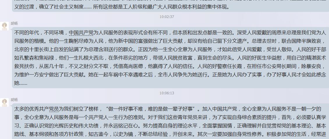 胡杨同志联系全心全意为人民服务的党的根本宗旨,介绍了建党九十五年来一些优秀共产党员的榜样力量,并号召大家向这些优秀党员学习,志存高远,脚踏实地,共同为祖国、民族的明天奋斗。