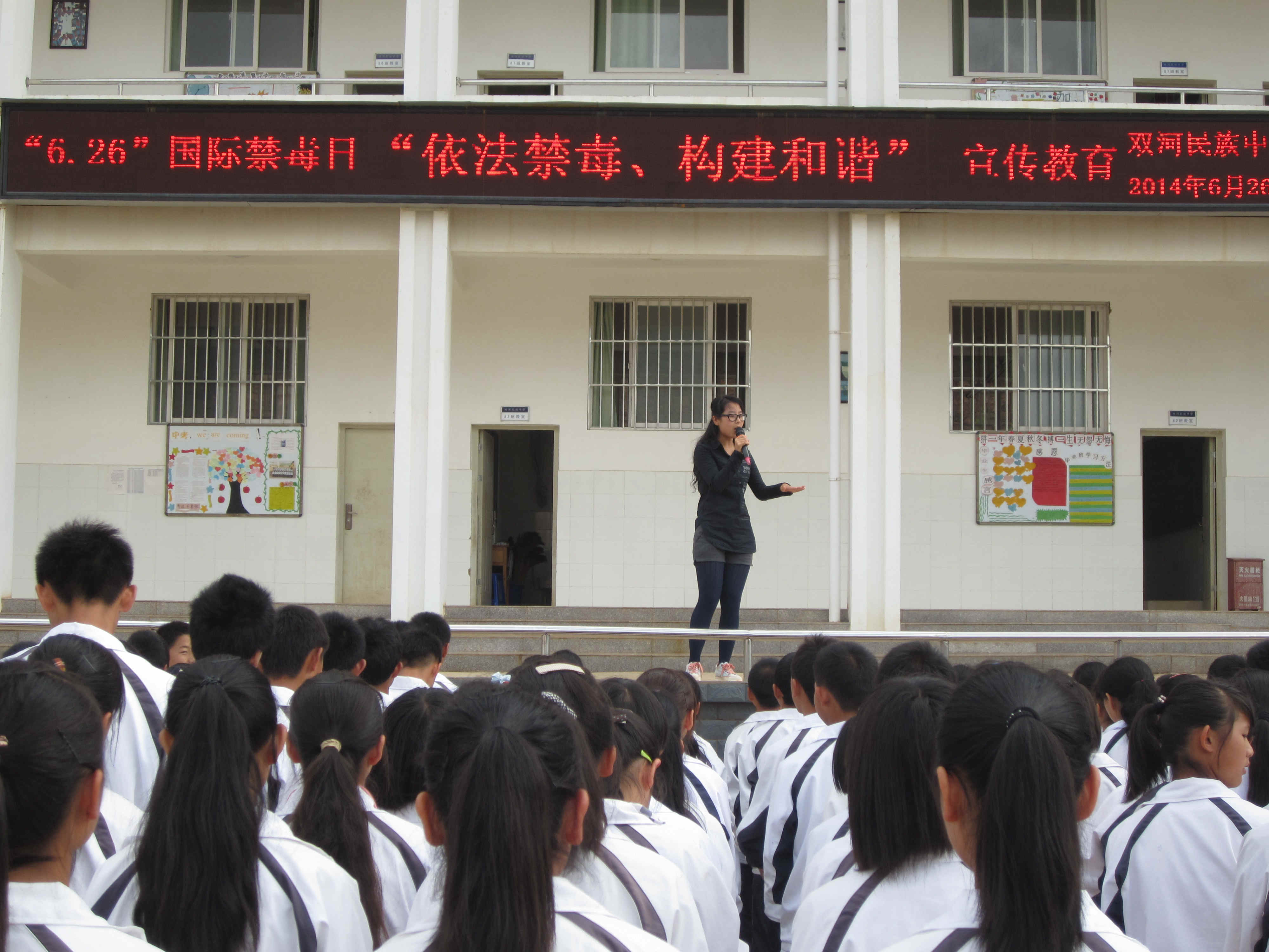 6月26日国际禁毒日,在双河民族中学“依法禁毒、构建和谐”的宣传教育活动上,我院晋宁双河实践队临时党支部书记杨应越代表实践队向学生宣传禁毒知识。