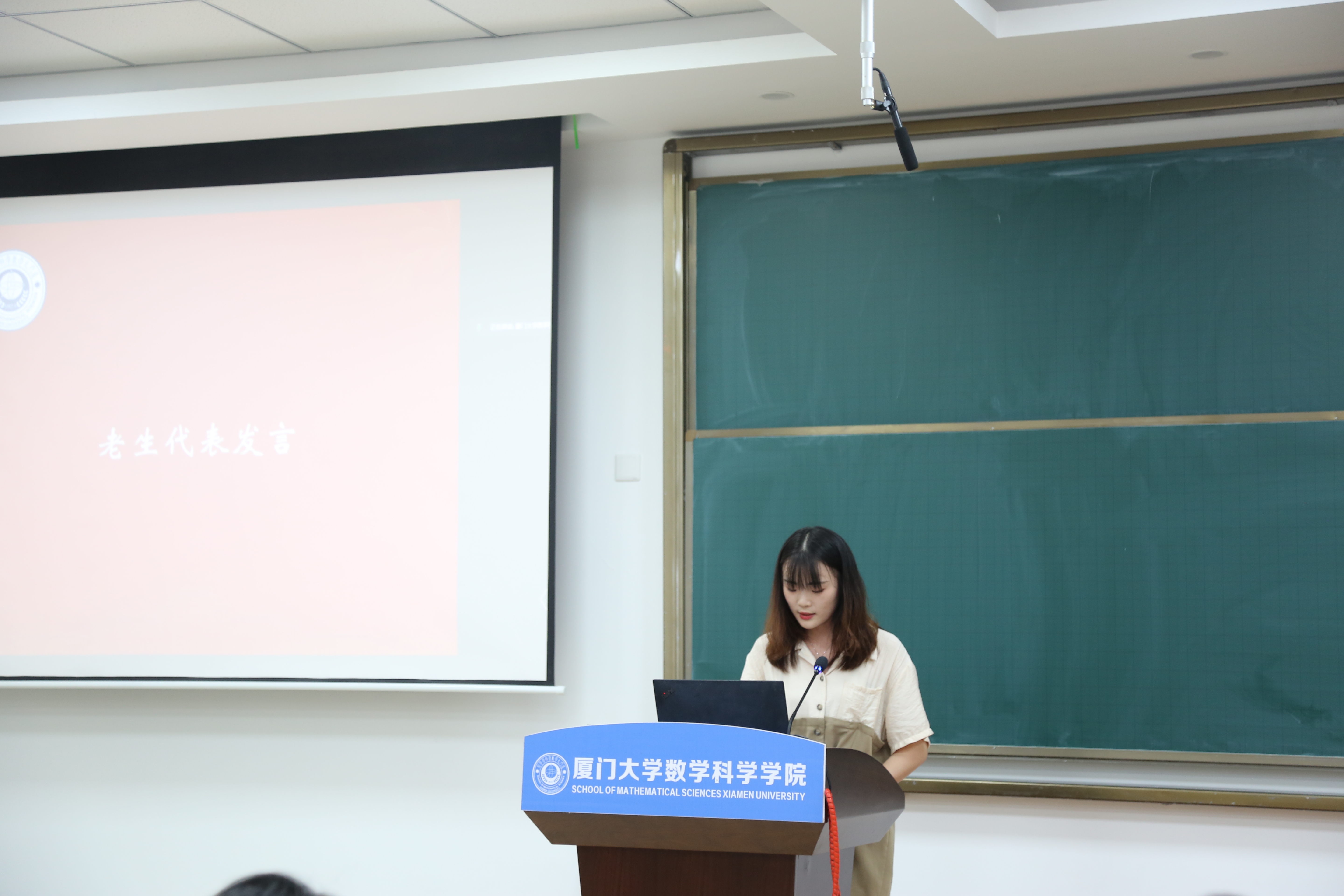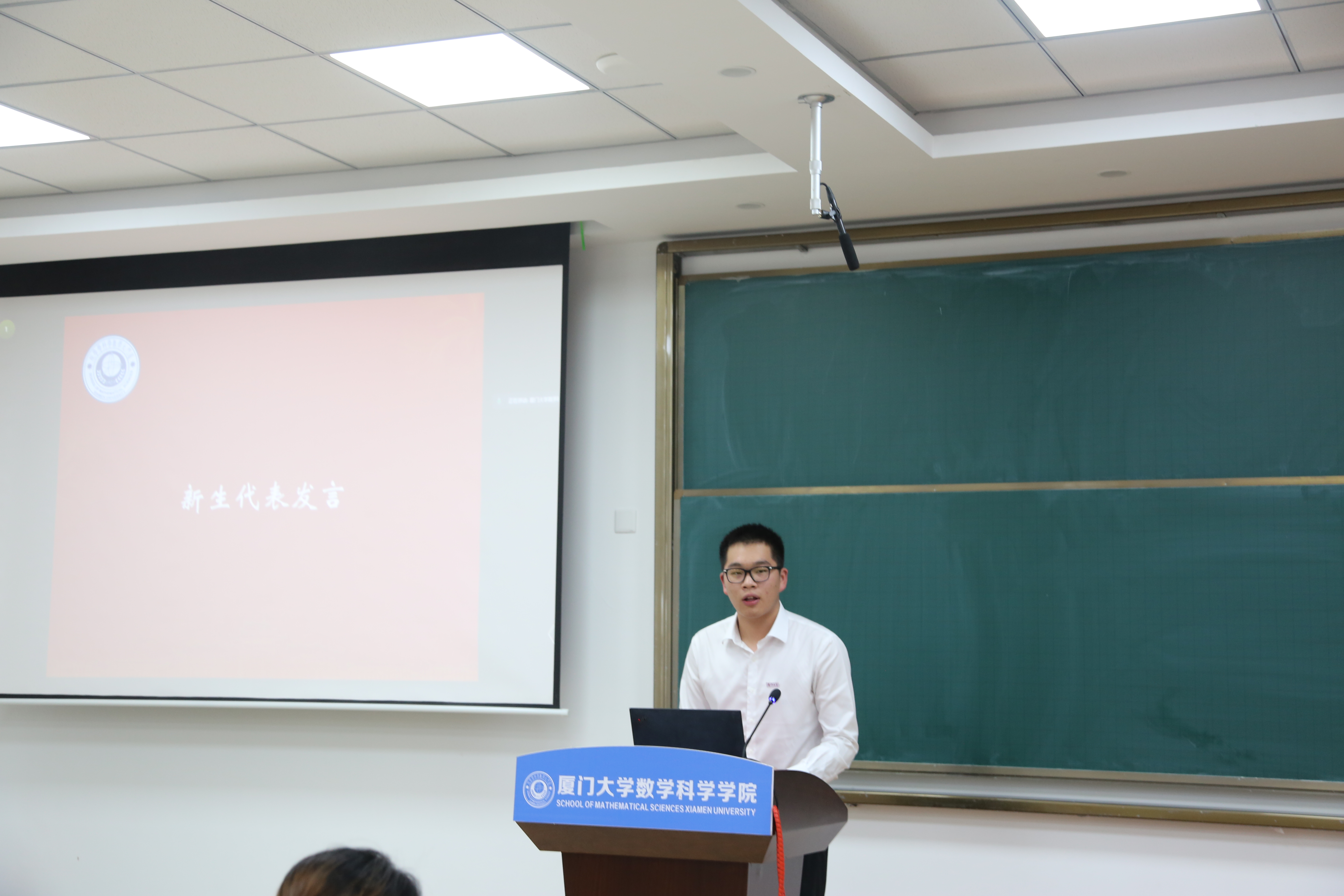 教师代表宋翀教授用六个C开头的单词对全体新生的大学数学生涯提出建议:Courage(勇气)、Challenge(挑战)、Confidence(信心)、Curiosity(好奇心)、Communication(沟通)、Cherish(珍惜)。他鼓励同学们要对数学保持好奇、勇于挑战,积极拥抱未来的厦大时光;要珍惜学院为大家提供的良好学习条件和成长成才机会,珍惜大学四年和老师和同学的相处时光。