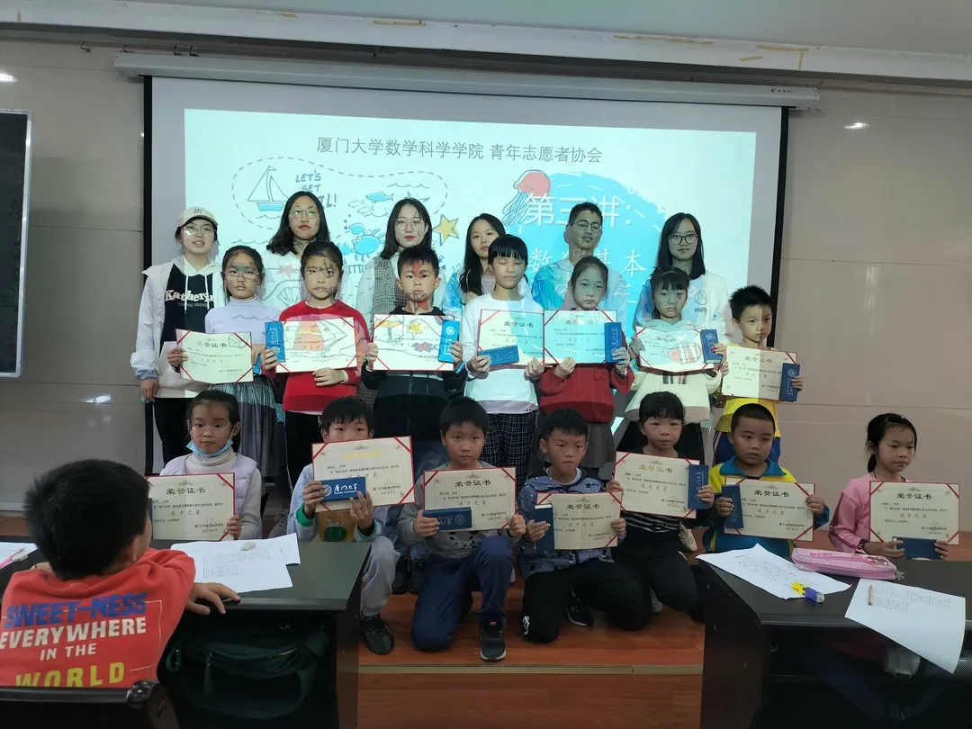 在课程的最后,厦门大学数学科学学院“数往知来”数独教育实践队综合评估学习态度和课堂表现,给表现优异的同学颁发了奖状,并鼓励所有的小朋友们努力学习、勤于思考,把数独课堂学到的知识和思维方法运用到生活和学习的方方面面。