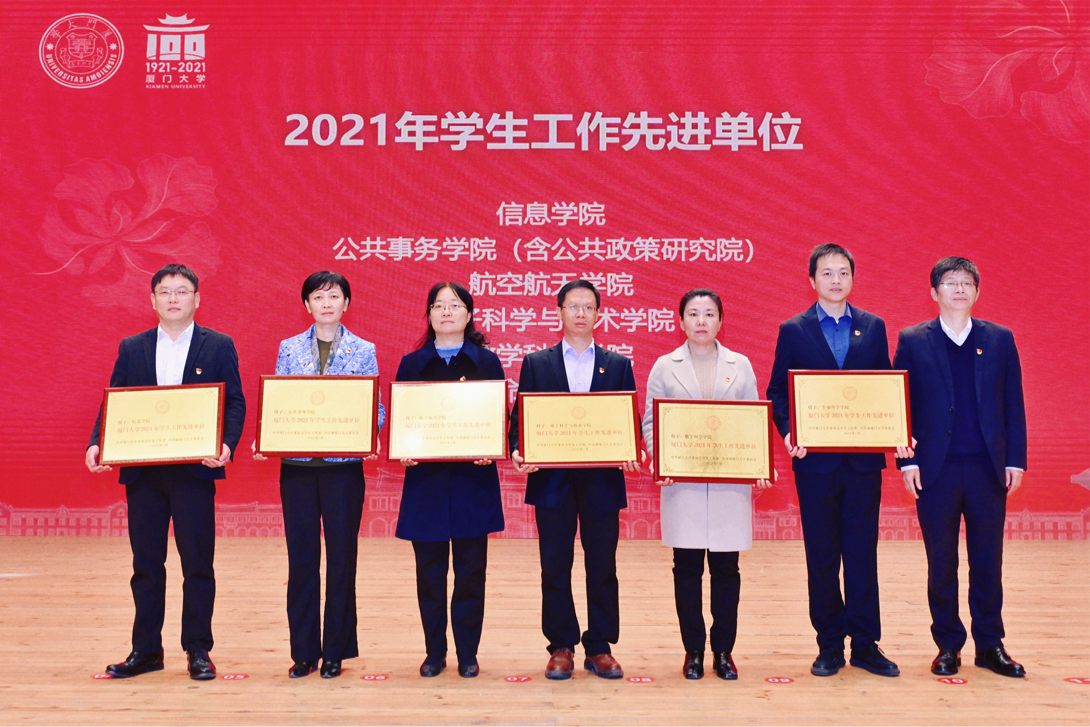 1月15日,厦门大学2021年学生工作总结表彰大会在科学艺术中心音乐厅举行。校党委副书记徐进功出席会议并讲话。校关工委顾问黄如彬,校党委常委、组织部部长、统战部部长孙理,校关工委副主任白锡能、梁卫中、郑冰冰,学校相关部门单位领导出席会议。数学科学学院党委副书记毛通双、丁昌利,团委书记于正伟,团委副书记陈淑铌,专职辅导员华盈鑫,党政辅导员陈依杭参加总结表彰大会。