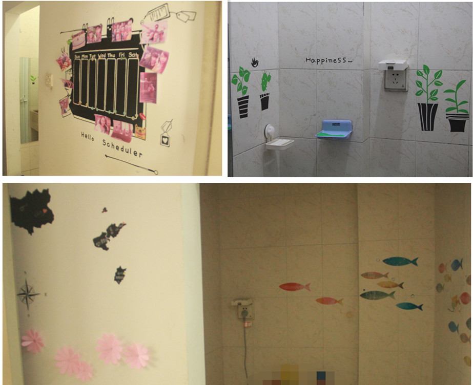 H5-207 ,这是一个叫“时代四撒姐妹花”的寝室,成员是王辰晔、郑家琳、翟紫雪、于凭跃。一打开门,就是粉与黑的照片墙——照片与值日表的结合。点缀着的手工、贴纸精致可爱,在装点小窝的同时,也传达出寝室的温馨可爱,她们的宣言是“为中华之崛起而美化宿舍!”。