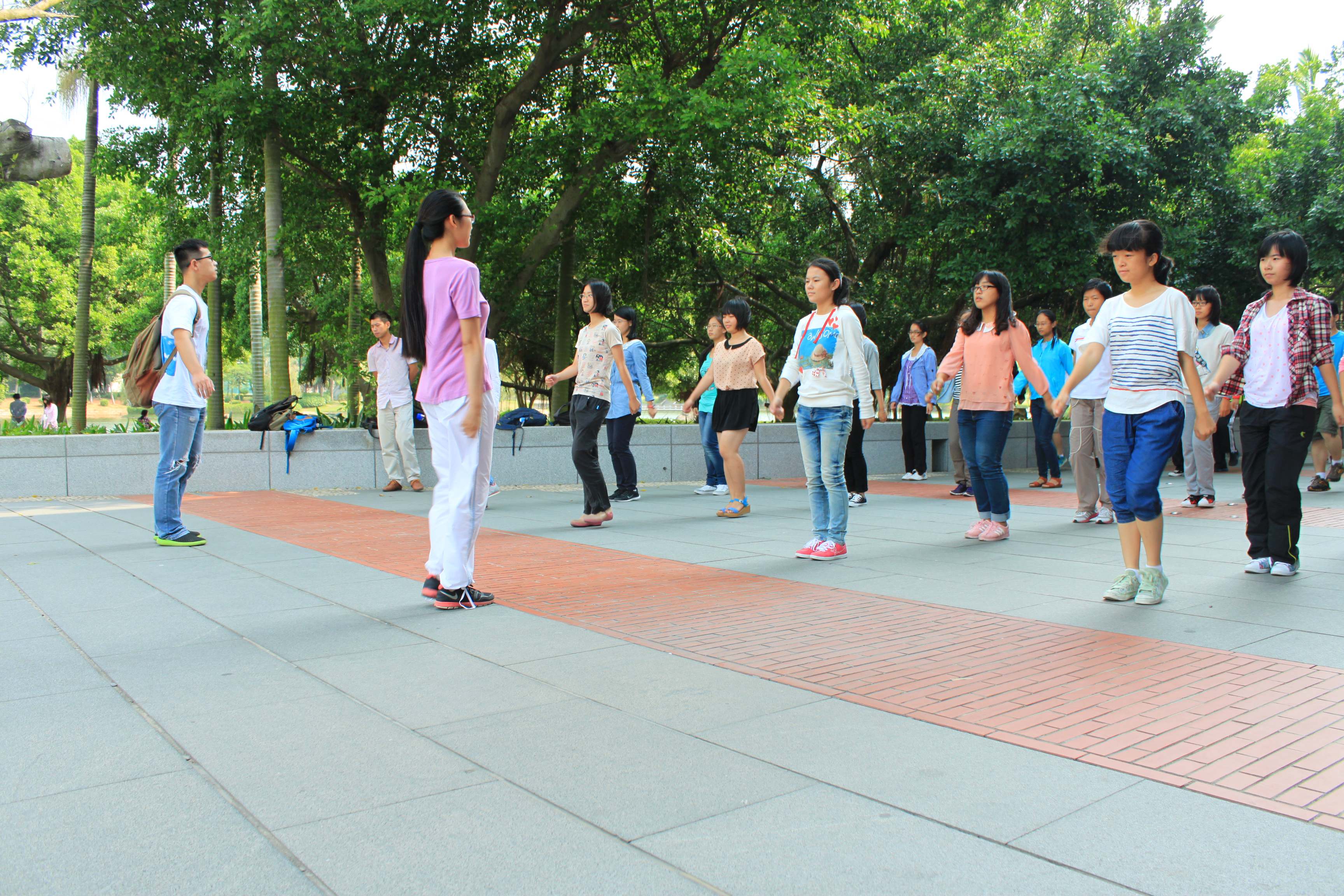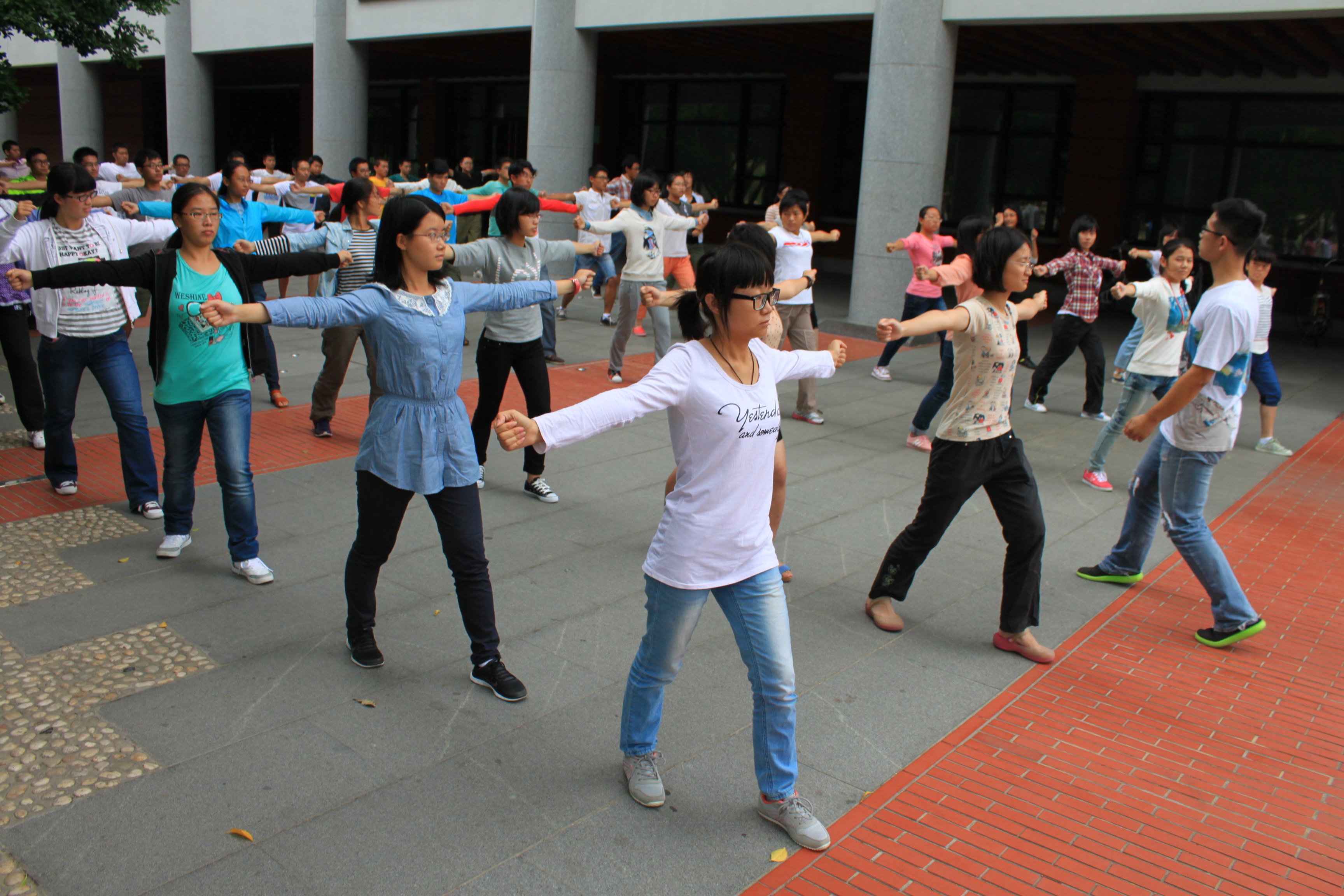一个小时之后,为使同学们的动作整齐划一,赵老师用手打拍并让同学们统一喊口号,该方法取得了明显的效果,恩明楼前口号阵阵,同学们的动作也逐步整齐划一。