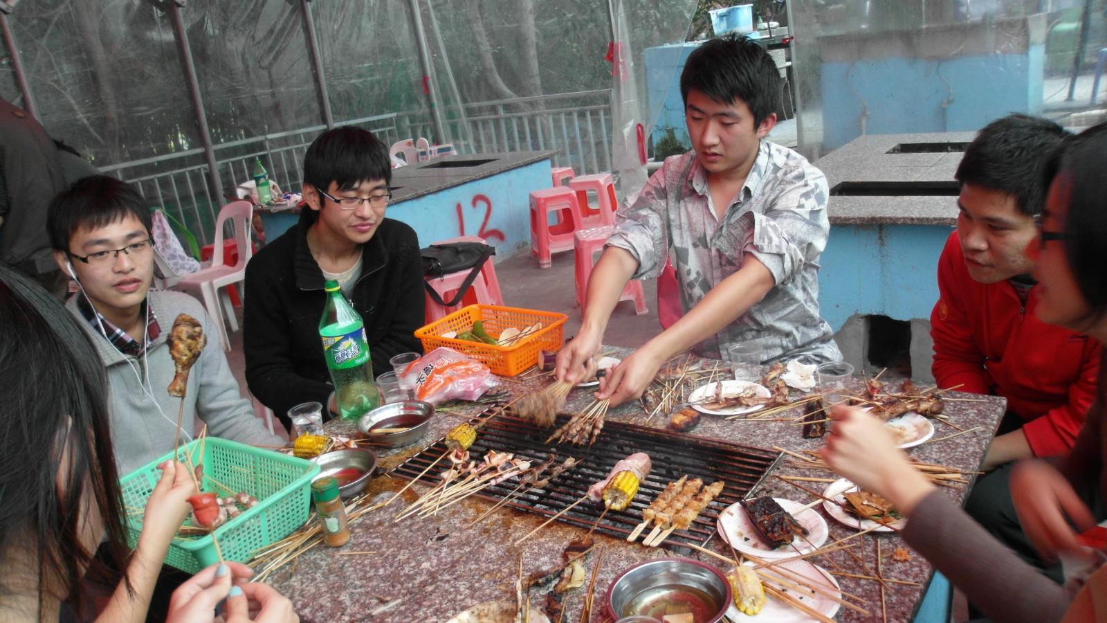 第一站:自助烧烤。抽签分组结束之后,便是各路“大仙”各显神通了:吴博高超的吴氏肉串烤法,王雪松出品的松牌香菇,众人争抢,周琦的四鸡腿齐上架,更有赵乐的馒头吃饱烧烤攻略。火不够旺,我们一起煽;肉不够熟,我们一起烤;天不够暖,我们一起热闹;烧烤场中充斥着甜蜜的笑声,佩服的惊叹声和层层叠加的亲近感。