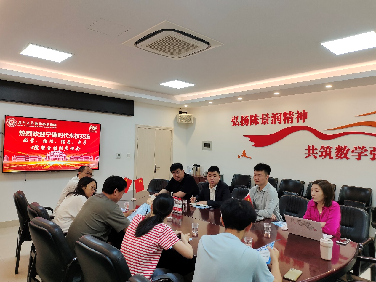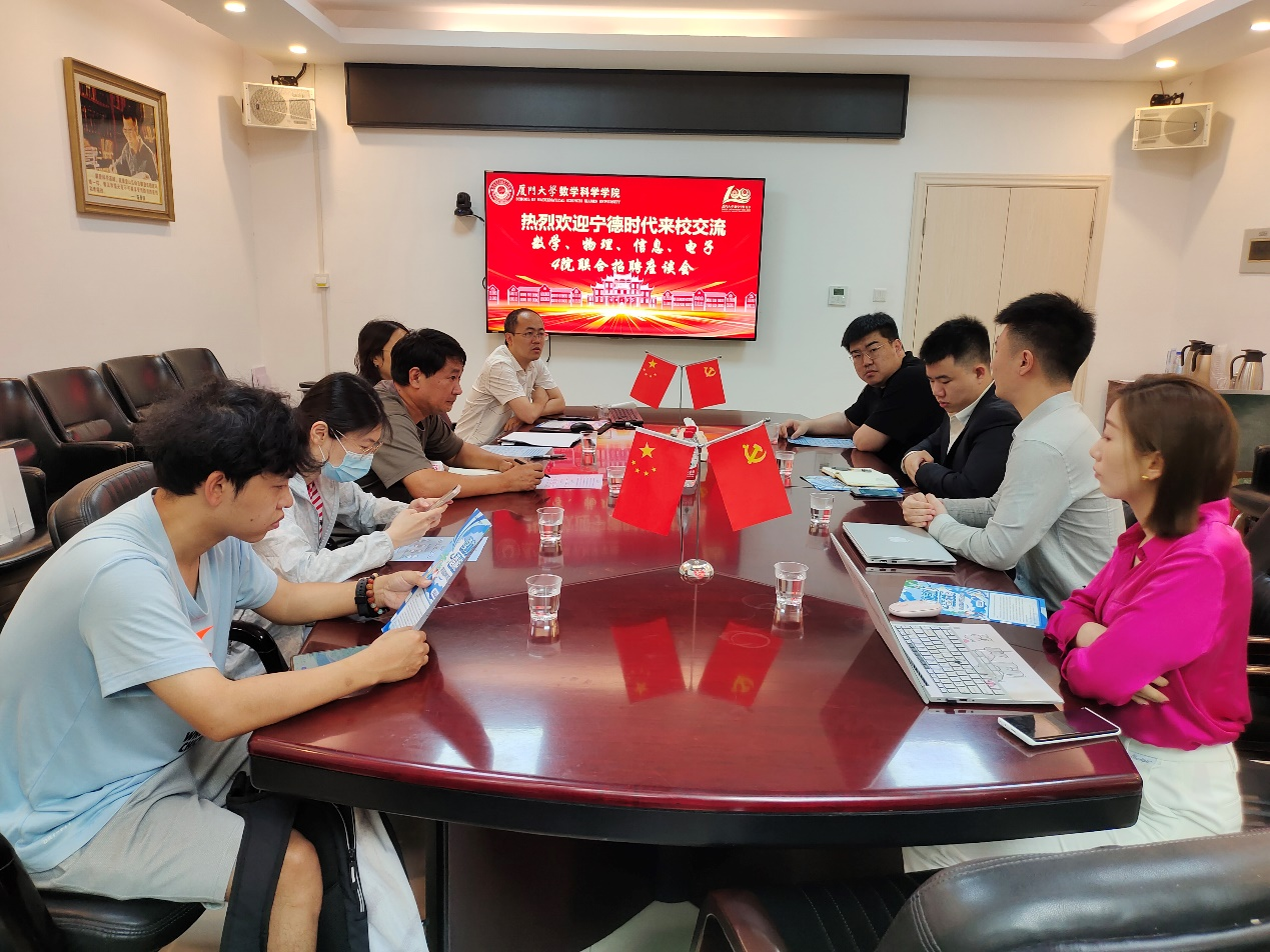 为进一步深化校企合作,切实做好2023年毕业生就业及学生实习工作,5月18日,宁德时代新能源科技股份有限公司的招聘代表胡泳涛一行来到我校海韵园开展四院联合招聘座谈交流活动。数学科学学院党委副书记毛通双和团委书记于正伟,物理科学与技术学院团委书记范荣、信息学院兼职辅导员李清润、电子科学与技术学院兼职辅导员陈诗敏以及学生代表出席交流会。