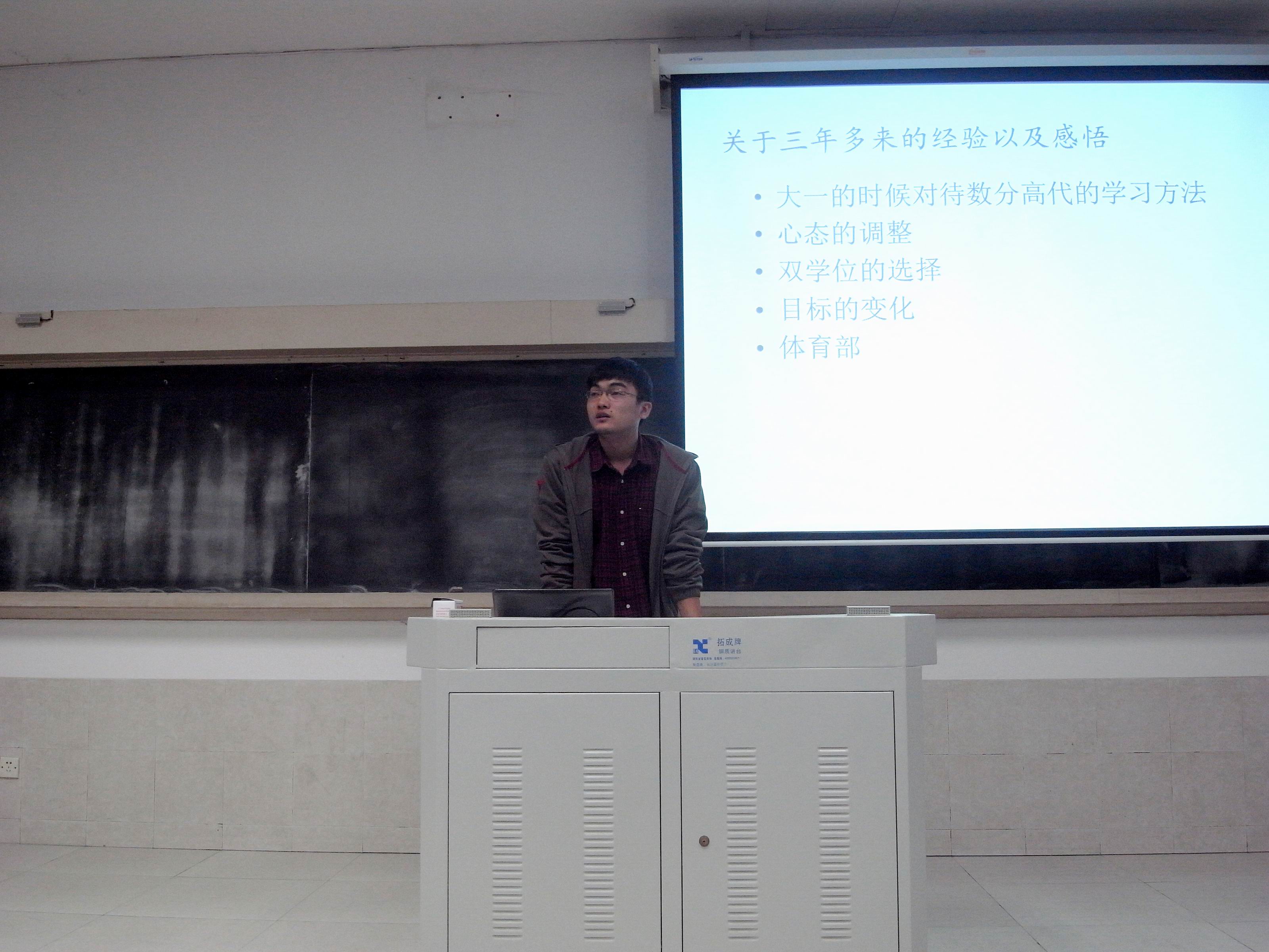 最后,王志雄学长结合自己的学习经历,跟大家谈了谈学习数学分析与高等代数的方法,强调了调整心态的重要性,对修双学位进行了理性分析,分享了自己在做学生工作时的心得体验。