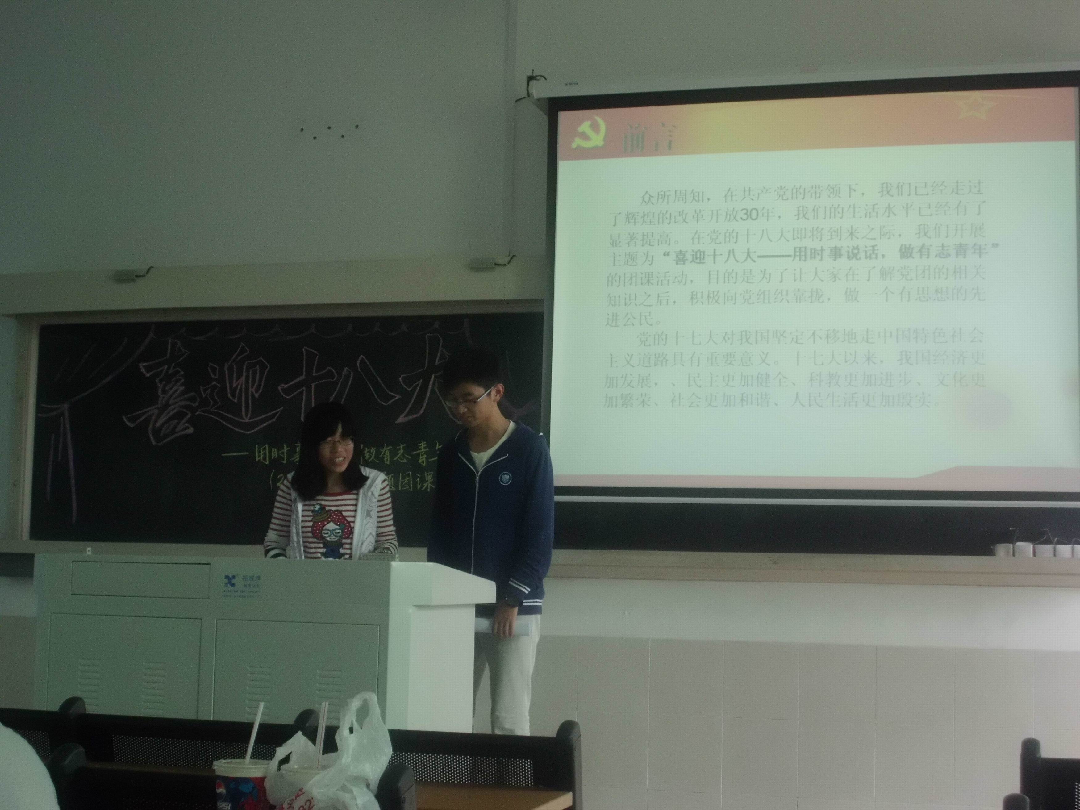 团课之初,团支书和班长就十七大以来国家和党在数项重大事件进行了回顾,展现了我国在军事、外交等方面的大国风范以及党在面对挑战时的良好面貌。该部分的介绍紧密联系实际生活中可见可闻,使得同学们与这些大事件“零距离”接触。接下来,精彩激烈的“一站到底”更是将团课的氛围推向了一个小高潮。“一站到底”以党团知识与社会热点知识竞赛的方式充分调动了同学们的积极性,大家踊跃参与其中,同时通过这样一种趣味的形式普及了党团知识。其间许灵达、赵乐等同学突出的表现更是激起台下一阵阵掌声。