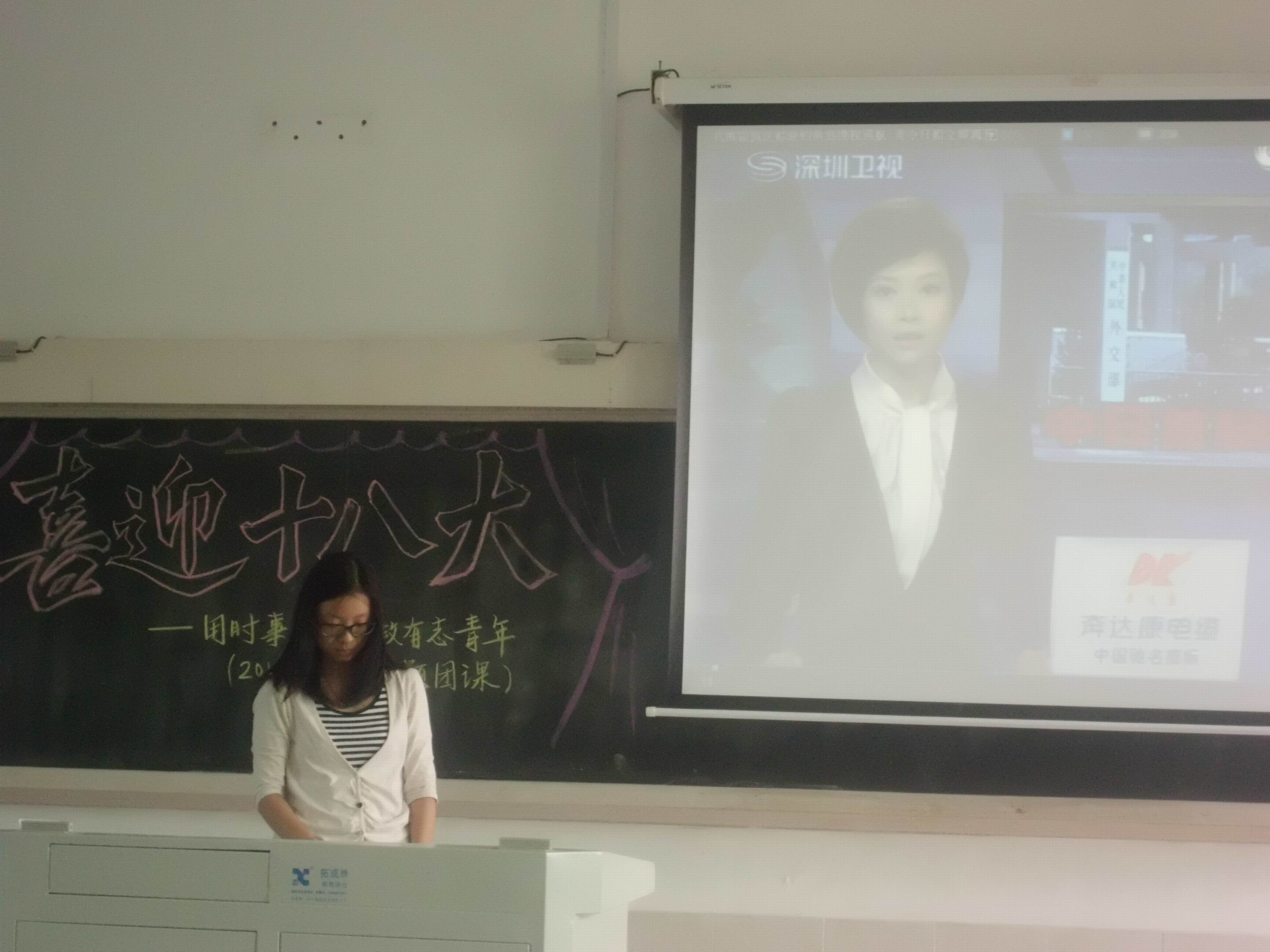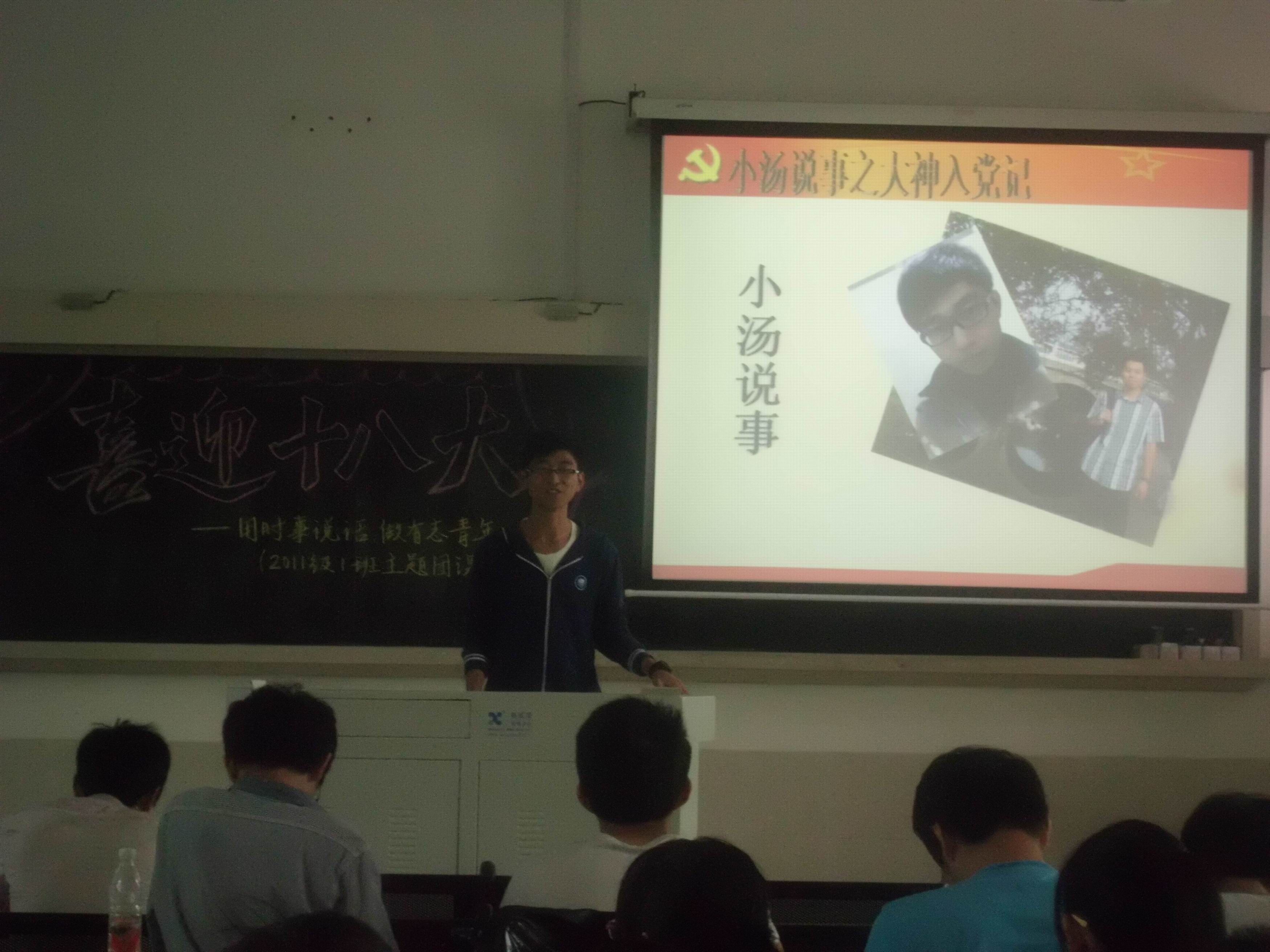 通过紧密联系实际来普及党团知识,并在班级上做入党动员工作,为十八大召开献礼,2012年11月7日星期三下午两点半,2011级1班团课在学生公寓302教室准时开展,参加团课的人员有2011级辅导员石义凯老师及2011级1班全体同学。此次团课以“喜迎十八大,盘点时事热点,争做有志青年”为主题,围绕近期国内外大事热点及党团知识展开了讨论。