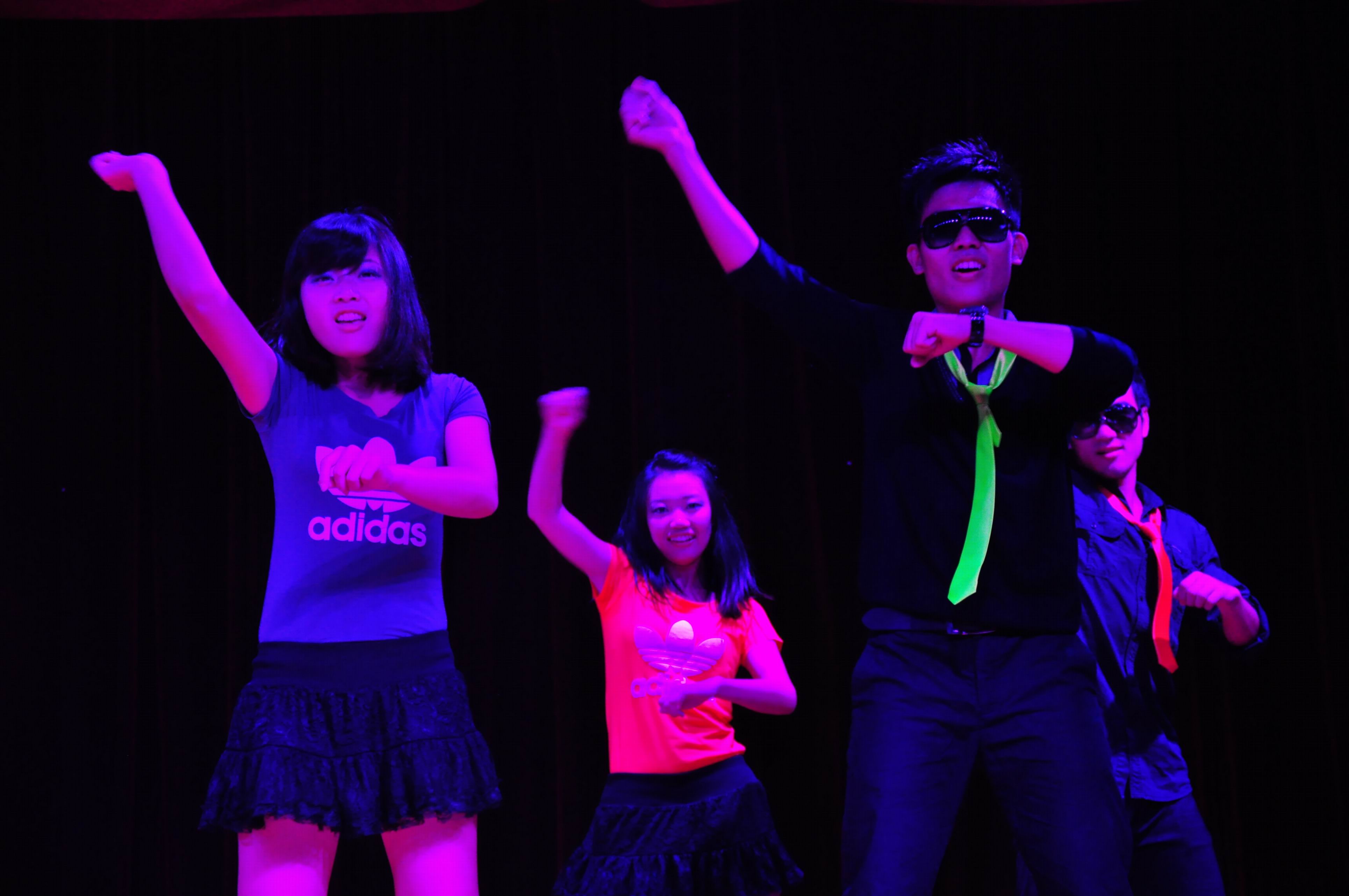 伴随着一声重音响起,由11级牛坤立、李奕豪等11名同学带来的开场舞《江南Style》洋溢着火辣的激情,瞬间掀翻全场。