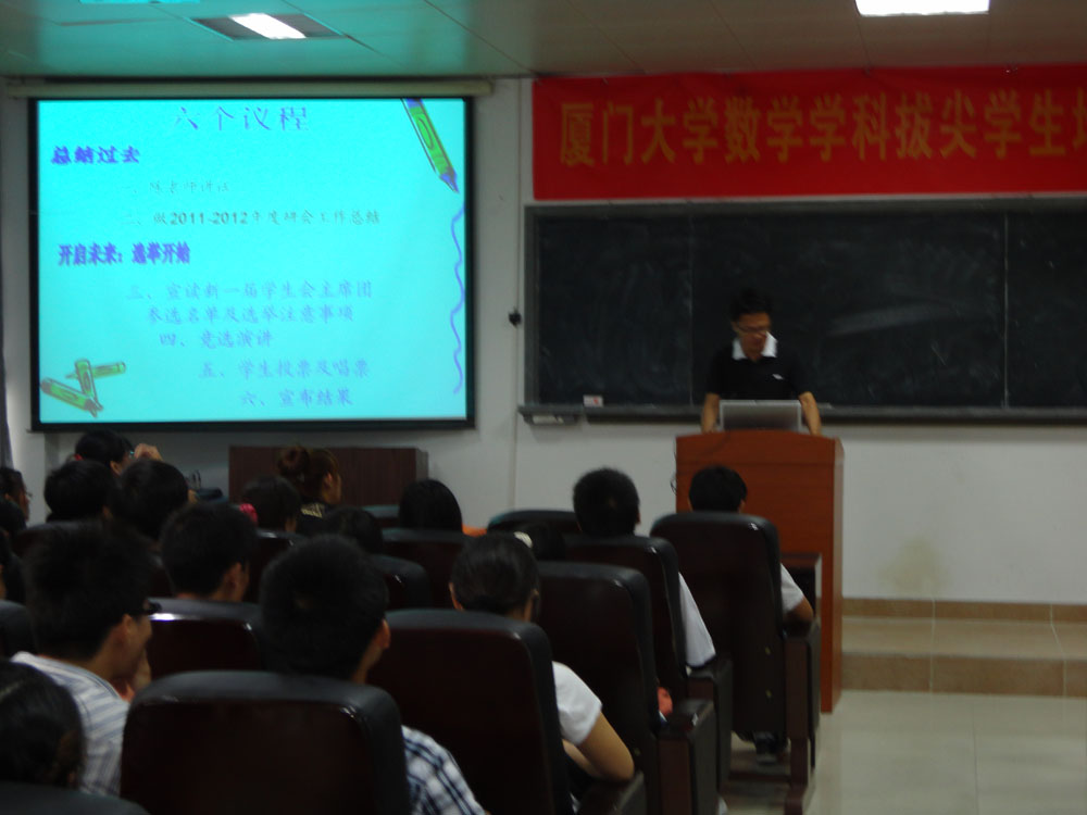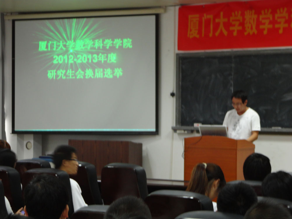 2012年10月11日,厦门大学数学科学学院研究生换届选举大会于海韵实验楼105室举行。会议由前任研究生会副主席苏兴泉主持,辅导员陈向柳老师出席了本次会议。首先苏兴泉向全体研究生介绍与会的各位领导以及会议议程。在一片热烈的掌声中陈向柳老师为同学们做了诙谐幽默的讲话,鼓励广大同学积极参与各项活动,充分展示了作为数学人的风采。随后本届研究生会副主席王勇同志对前一学年的研究生会工作进行了总结汇报,对前一学年取得的成绩给予了高度的肯定,同时也指出了研究生会工作中存在的不足。最后,研究生会的换届选举正式拉开帷幕。本次研究生会换届选举坚持民主、文明、高效、务实的工作方针。