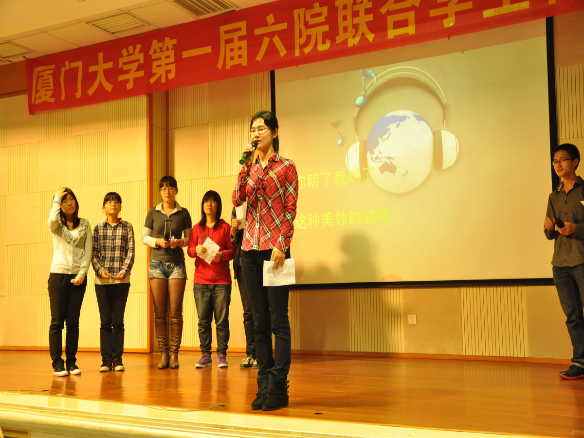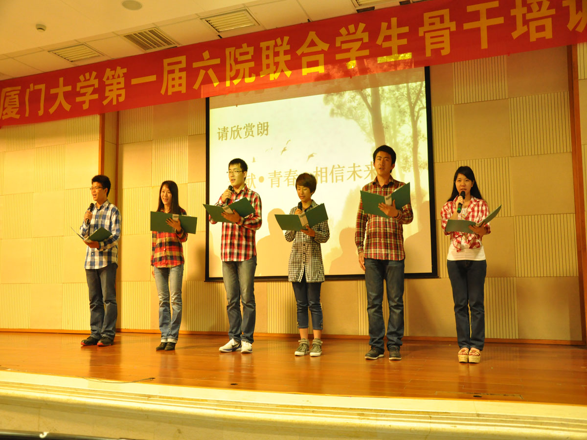 首先,由六位干训学员代表深情献上诗朗诵“奉献·青春·相信未来”。我院2011级吴博参与其中。(图中左二)