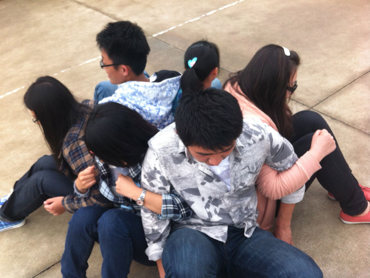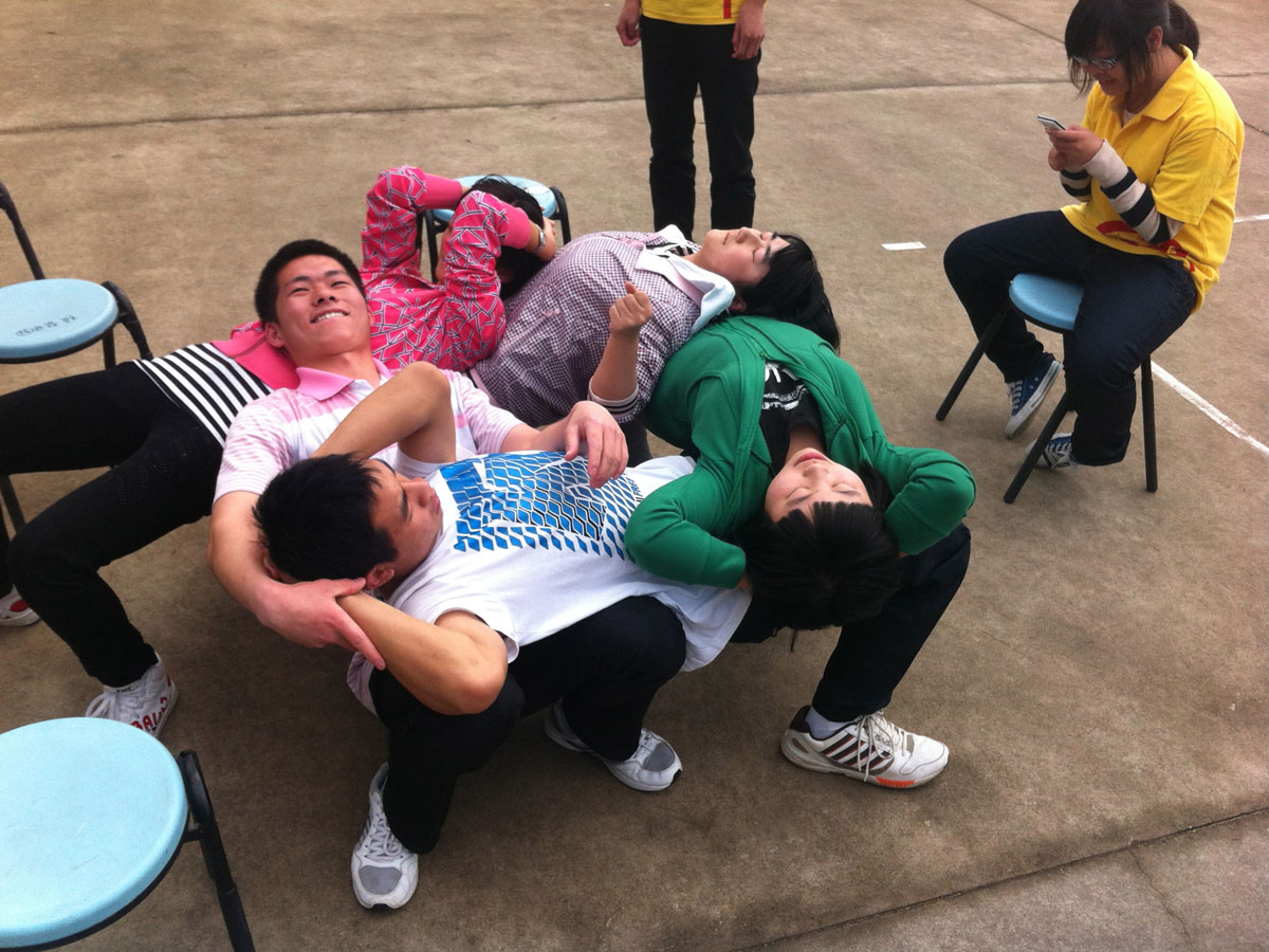 团队竞赛环节将整个素质拓展活动带向了高潮。该环节分为若干部分,均需由团队配合完成。第一个环节是不同小组成员坐在凳子上相互枕靠后抽取凳子,凭借学员之间的配合,在没有外物支持的情况下坚持一分钟,学员们虽说大汗淋漓,却依然在合作中体会到了团队的重要性。第二个环节增加了思维能力的测试,一组答题,一组体验七步生死线,答题直至全体组员通过七个方格,任务完成。之后的两个环节相似,在考验学员身体素质的基础上,强调了团队合作的重要性。