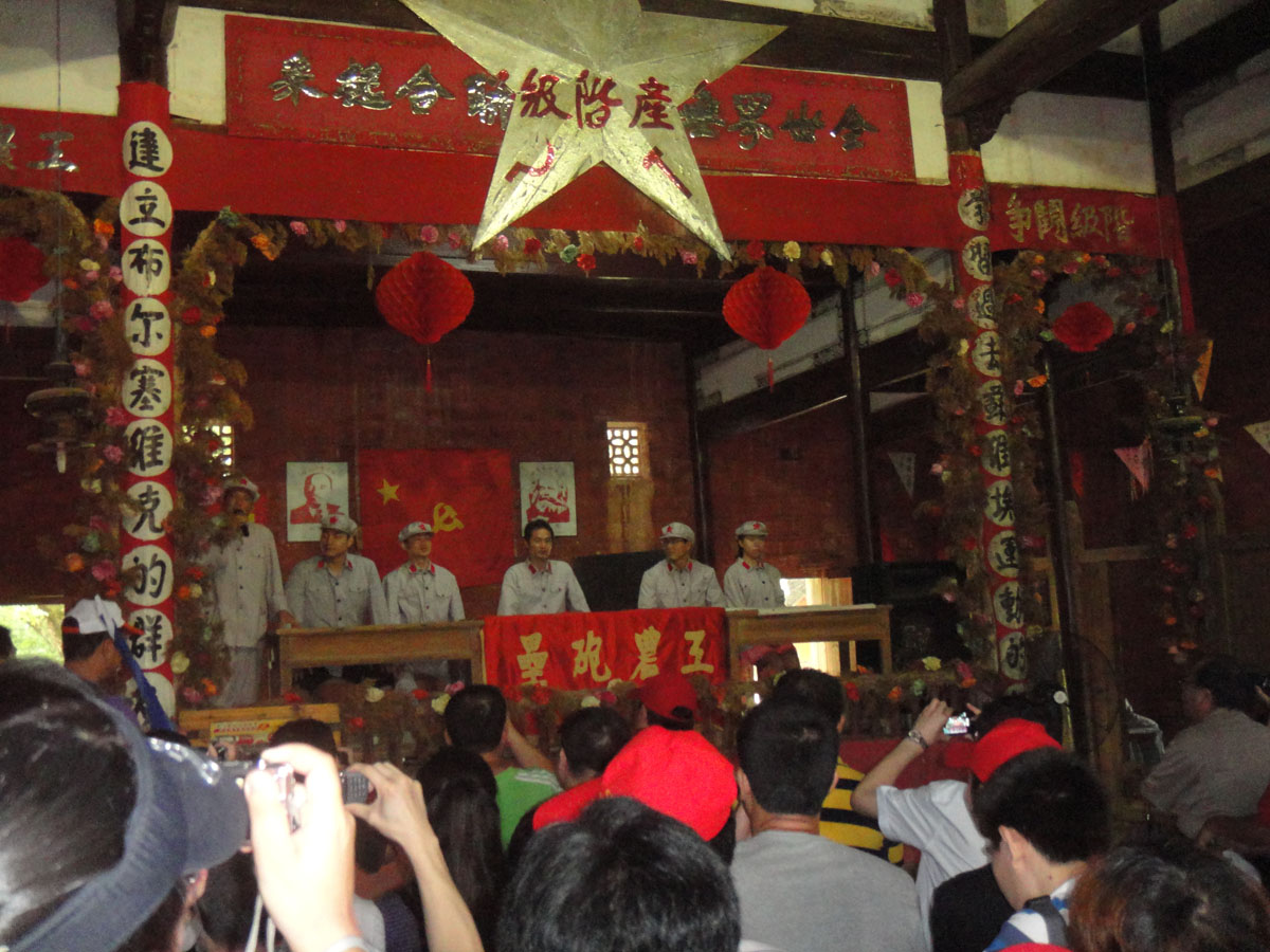 7月17日上午,实践队奔赴江西瑞金,寻访中华苏维埃共和国临时中央政府旧址(叶坪)及沙州坝。黄泥墙,乌瓦屋,都充满了历史的印记——80年前毛泽东、周恩来、朱德等来自全国各地的610名代表,举行具有深远历史意义的中华苏维埃工农兵第一次全国代表大会。每一位工作人员,都身着灰土布、红领章,使人不由自主地追忆那峥嵘岁月。工作人员的现场表演,精彩重现了第一次全国代表大会时的场景,令队员们印象深刻。沙洲坝上那一口红井更是时刻提醒着人们“吃水不忘挖井人,时刻想念毛主席”。
