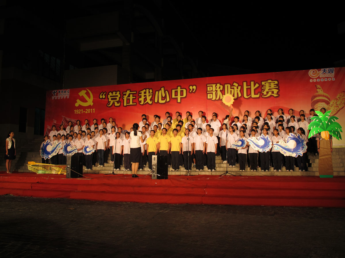 大合唱比赛的每支队伍都经过了精心的准备:整齐的着装、嘹亮的歌声、多样的形式,不仅让人们看到了大学生的激情与活力,更让人们深深感受到了我校学生对党的热爱与赞美之情。我院与国际关系学院代表队的参赛曲目是《鼓浪屿之波》,经历了初赛的磨砺,站在决赛舞台上的同学们个个精神饱满,爽朗的微笑显示着他们的自信与热情,优美的歌声诠释着他们对海峡两岸同胞的祝福,深情的诗朗诵传递着他们对党和祖国的赞美,古朴的方舟、高大的椰树、飘逸的白云、初升的太阳是她们用心营造的浪漫海岛。由于相关人员操作失误,音乐提早结束,导致我们的演唱中途停止而影响了最终评分。虽然比赛得分无法改变,同学们还是通过积极的沟通争取到了在全部比赛结束后再次登台完成演唱的机会,同学们真情的演唱与顽强的精神赢得了台下领导老师以及全体观众的尊重与喝彩。