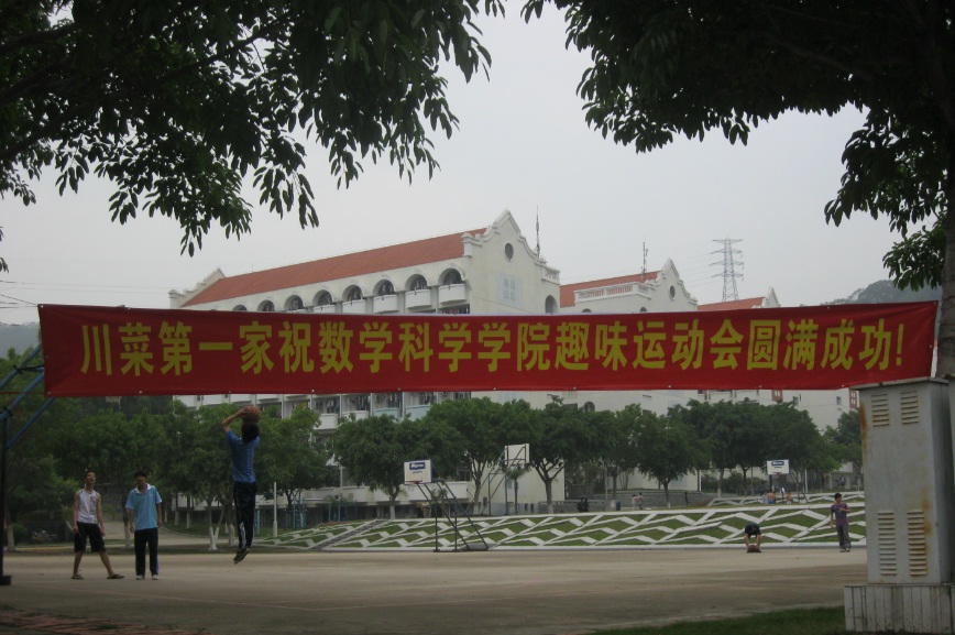 5月7日早8:30,数学科学学院在海韵公寓三期篮球场举行了别开生面的趣味运动会。此次活动是数学科学院送旧系列活动之一。本次活动的宗旨在于配合校庆的主题,展示出研究生应有的蓬勃朝气和竞技热情,丰富各个成员的课余生活,给每一位学生展现自我的机会。趣味运动会由川味第一家赞助。