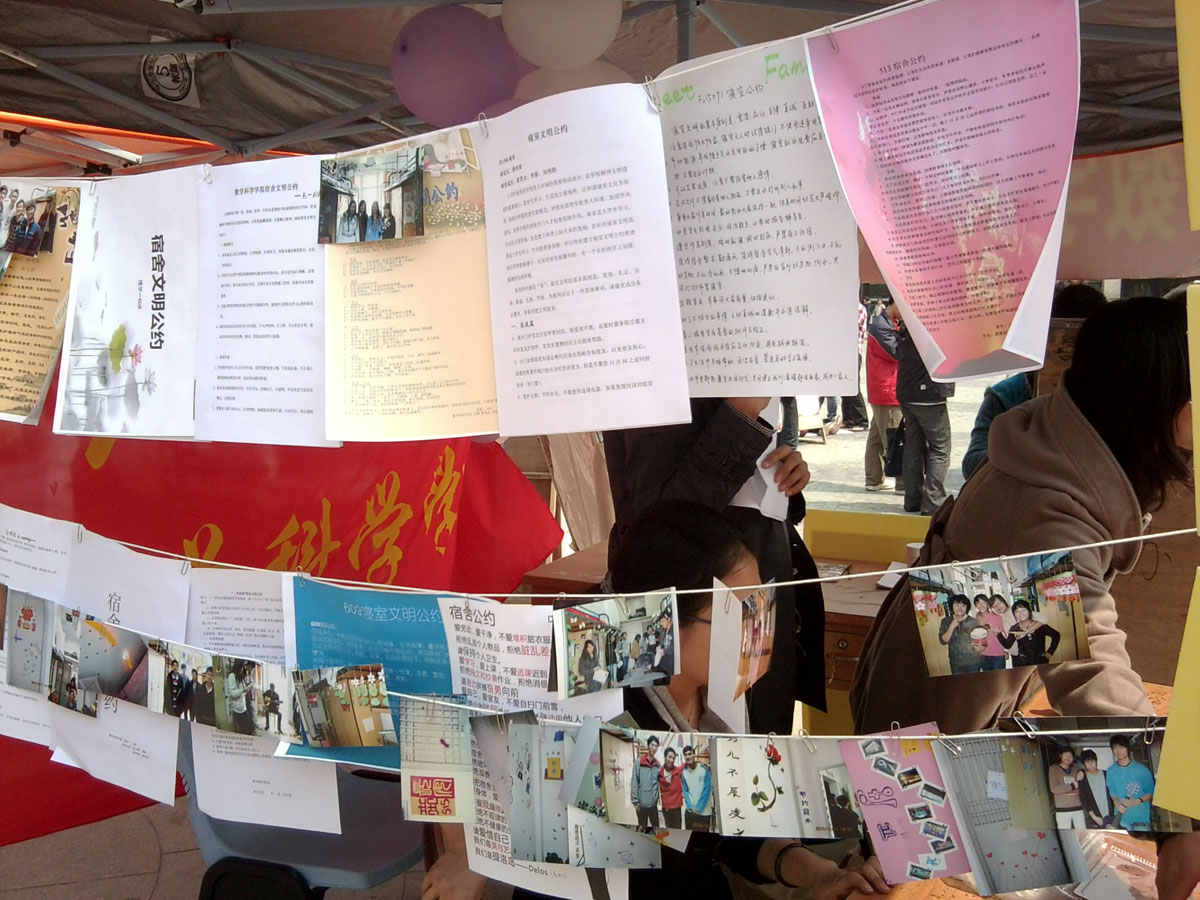 上午8:30,我院督导部就来到步行广场,开始了紧锣密鼓的现场布置。我院的活动展示分为五大部分:“宿舍美化大赛及宿舍文明公约”成果展示、知识问答之数学猜谜、“我们要对母校说”祝福征集、院刊展示和数学人文明公约。我院精彩的宿舍文化生活和有趣的数学猜谜游戏吸引众多同学驻足观看。