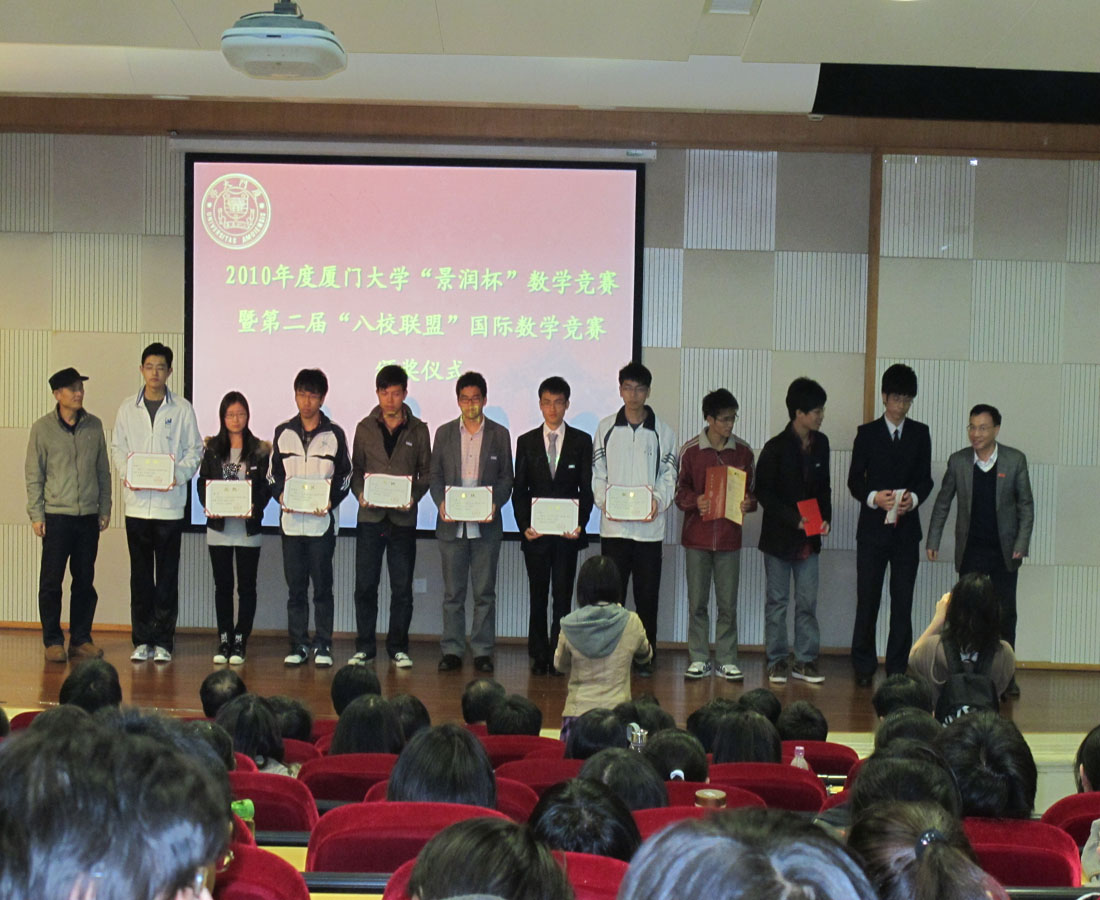 2011年3月4日晚上7点,2010年度厦门大学“景润杯”数学竞赛暨第二届“八校联盟”国际数学竞赛颁奖仪式在厦门大学漳州校区小报告厅举行。到场的领导有厦门大学副校长邬大光、厦门大学校长助理王巧萍、国际处处长毛通文、漳州校区管委会副主任黄田、经济学院党委副书记王艺宏、信息科学与技术学院党委副书记李芬芬、我院院长林亚南、副院长邱春晖、公共数学教学部主任林建华等。107名获奖学生及09、10级学生代表参加了此次颁奖典礼。