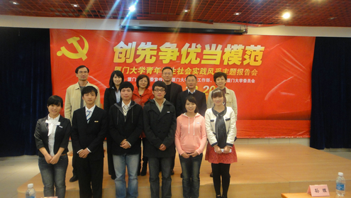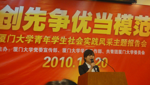 12月20日晚上7点,“创先争优当模范——厦门大学青年学生社会实践风采主题报告会”在厦门大学本部自钦楼隆重举行,经过校团委对优秀暑期实践队和实践个人的典型事迹的筛选,来自五个不同院系的6名研究生、本科生有幸在主题报告会上分享了自己的暑期社会实践经历。来自数学科学学院的08级本科生李曦在本次报告会上也讲述了她在实践活动中的所见所思。