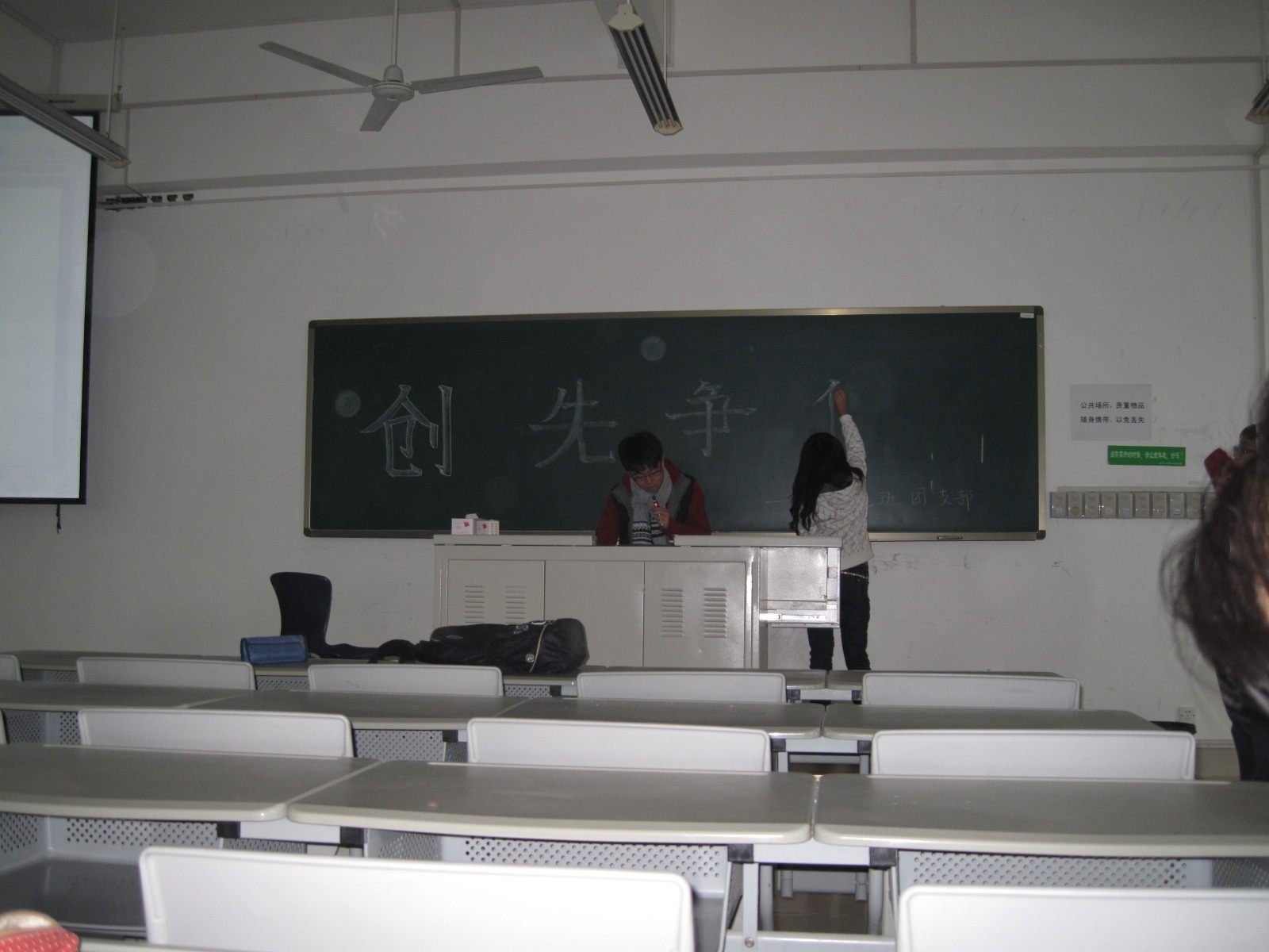 班会由团支部书记刘玉婷和班长汪旭泽主持。会上,随机抽取了几位同学上台阅读自己写的“创先争优”承诺书,刘玉婷同学鼓励同学们要借鉴以上优秀承诺,切实履行自己的承诺,争当创先争优积极分子。随后进行了本学期团支部推优。经过投票以及两位预备党员公正地唱票,向党支部推荐了15名优秀学生:王旭,聂子晔,唐潇,张滔,王倩雯,于丹,崔逸凡,朱李岑,刘玉婷,秦晓珊,廖军,何欣莹,薛小琳,王方舟,夏笑女(排名不分先后)。本次班会在同学们的积极配合下圆满结束。