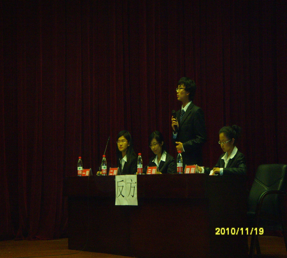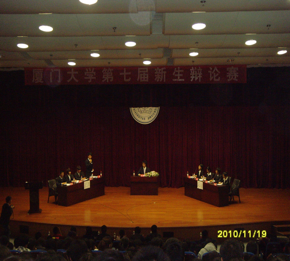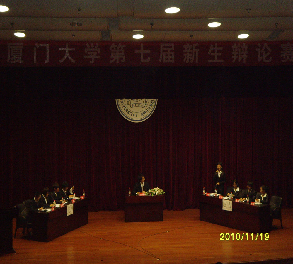 11月19日晚7点,由校区团工委主办、辩论学社承办的第七届厦门大学“新生杯”辩论赛在校区3号楼大报告厅开战。由我院10级新生郑鹊、周玉晶、韩乔、谭芮雨同学组成的代表队在揭幕战中发挥出色,战胜传统强队法学院代表队。