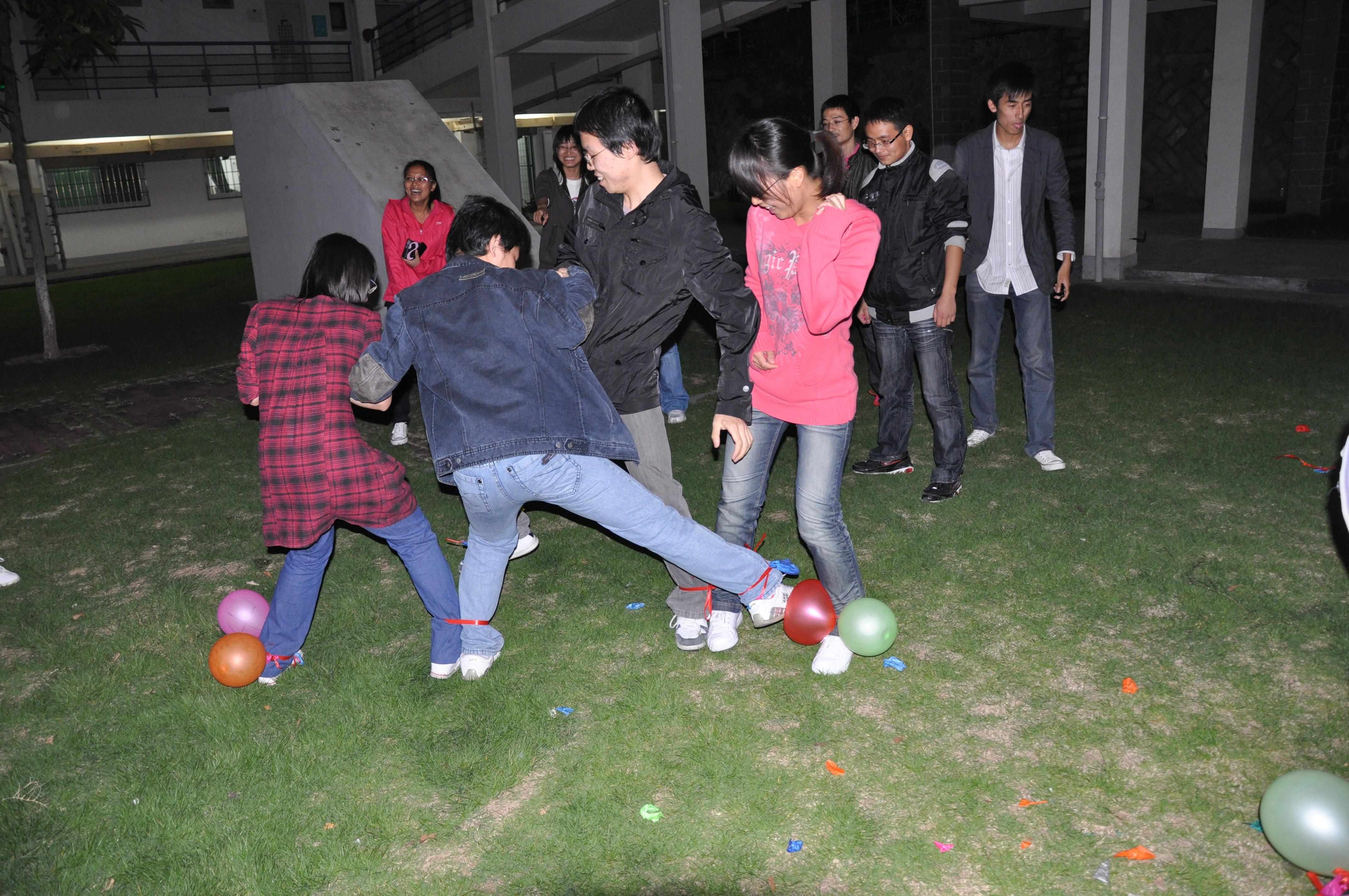接下来是游戏环节,女声比赛剥桔子,男生比赛吃桔子,大家分工合作。还有绑腿踩气球等等,通过这样的活动,同学之间相互了解。很多同学很感慨“每年班里都有组织活动‘慰藉’我们这些光棍,先别说爱情,很多友谊也是通过这样的活动建立起来的。”