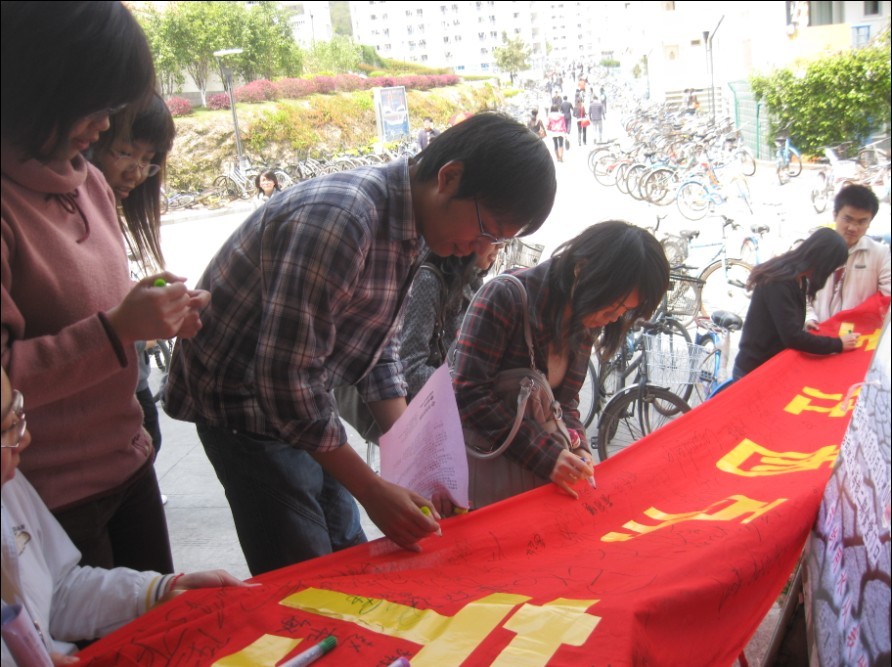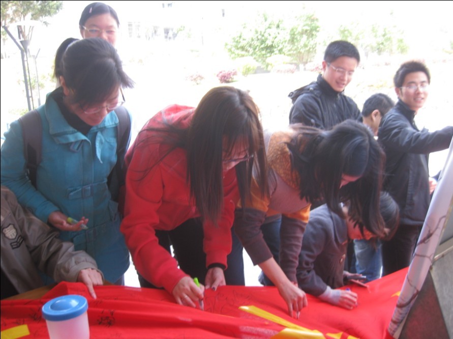 3月29日,数学科学学院09级研究生组织了一次主题为“关注西南 节约用水”的签名活动。在两个小时的活动中, 有近千名同学在红色的横幅上签名表达自己节约用水的决心。