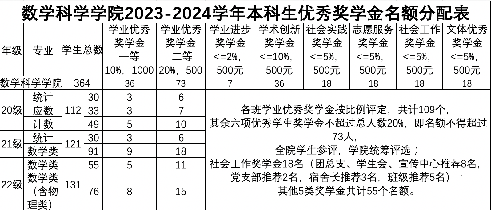 数学科学学院2023-2024学年本科生优秀奖学金名额分配表 |