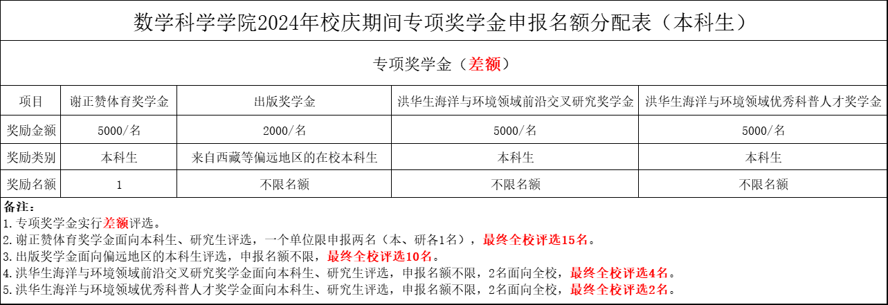 (2)获得本次校级专项奖学金的本科生不能参评2024年下半年校级奖学金和2024年本科生优秀学生奖学金,与2024年校庆期间校级奖学金不能同时兼得,但是可以参评2024年国家奖学金和国家励志奖学金。
