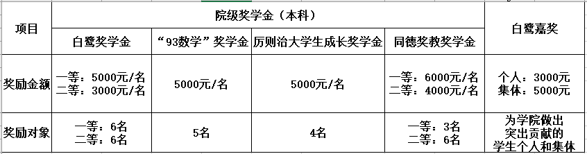 本次奖学金评选对象为厦门大学数学科学学院普通全日制在校二年级以上(含二年级)本科生。白鹭嘉奖面向厦门大学数学科学学院普通全日制在校本科生。白鹭嘉奖用于表彰在思想引领、科创竞赛、文体活动、志愿服务、社会实践、社会工作以及其他重大活动中为学院做出突出贡献的学生个人和集体,可由组织推荐和个人申报,白鹭嘉奖单独评选。