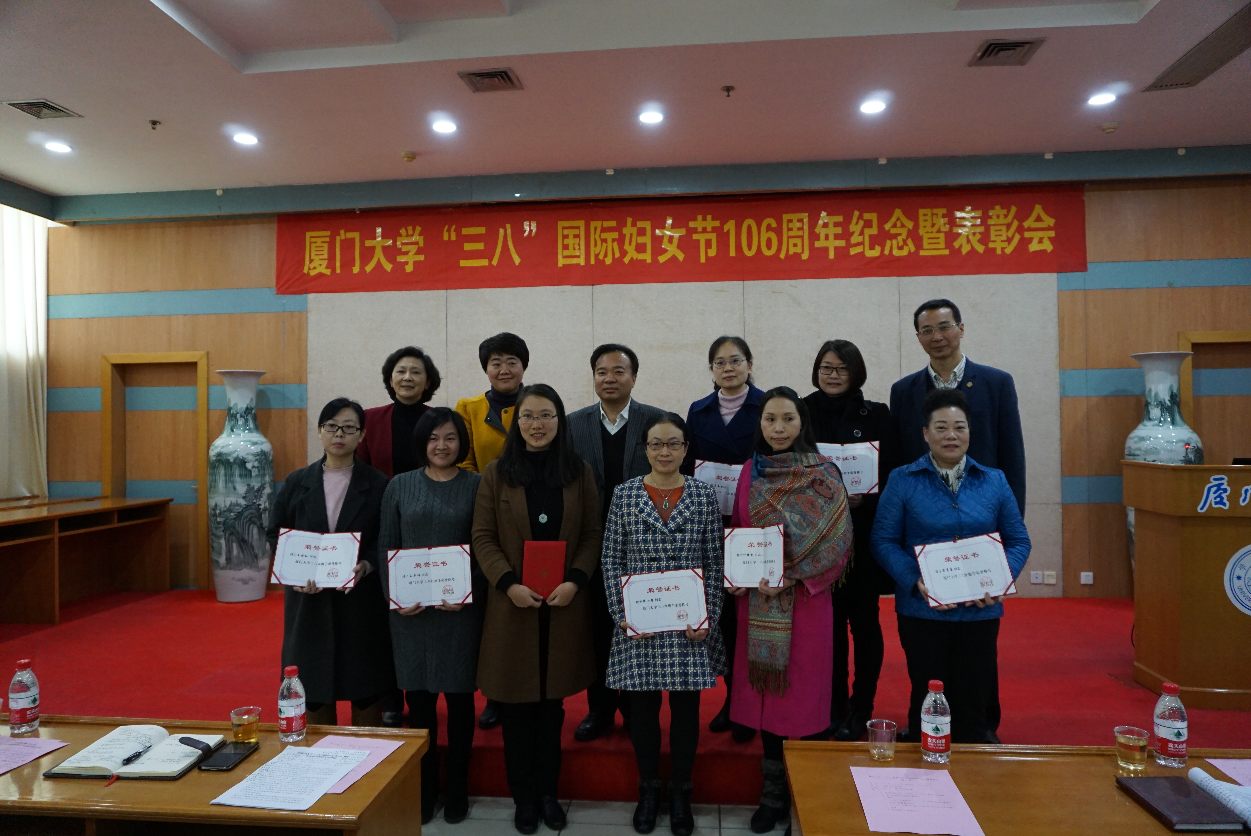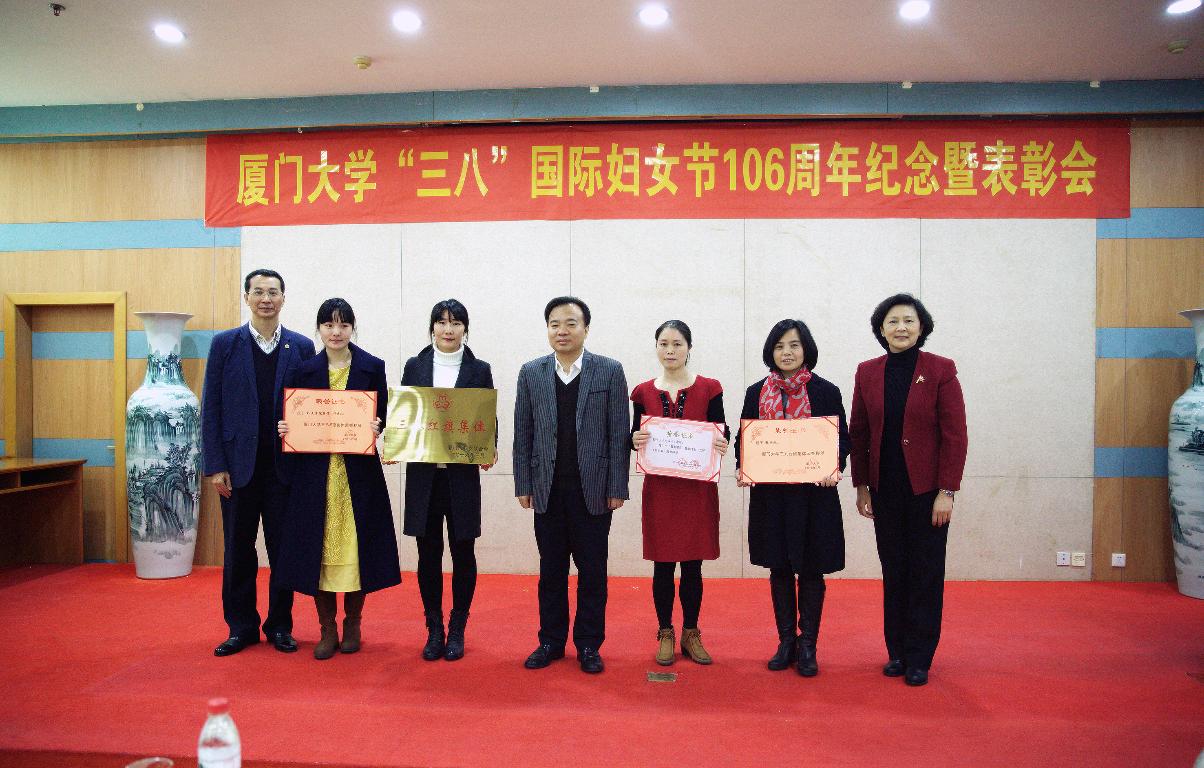 外文学院英语口译团队、教务处获厦门大学“三八”红旗集体荣誉称号,人文学院副教授王晓红、台湾研究院教授张羽、航空航天学院高级工程师李继芳、生命科学学院教授陈兰芳、学生工作处副处长刘艳杰、图书馆副馆长陈小慧、后勤集团勤业餐厅经理曾秀宝、附属中山医院演武分院护士长叶桂香、嘉庚学院院长助理王冬梅、嘉庚学院土木工程系副教授叶元芬被评为厦门大学“三八”红旗手。