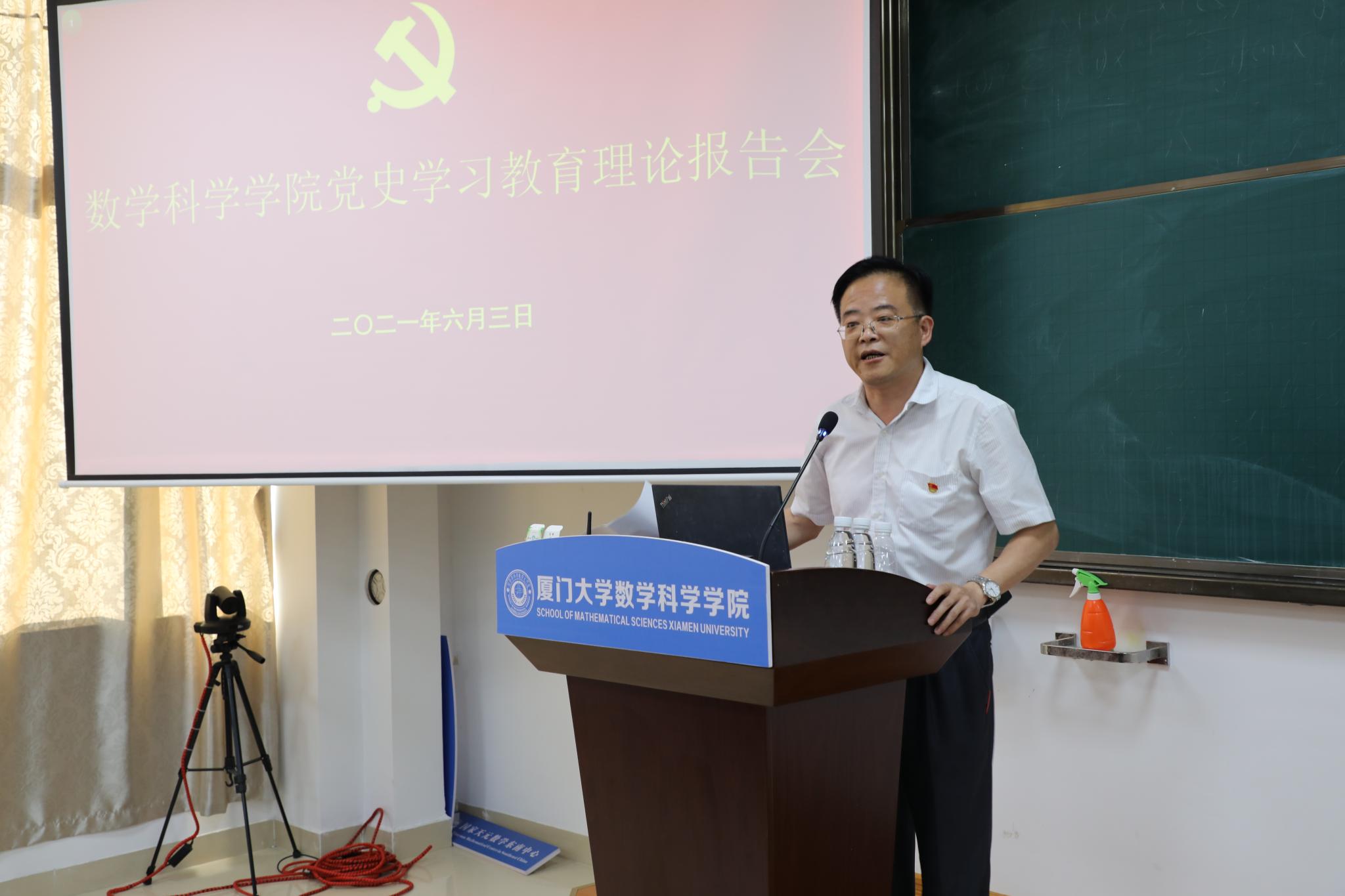 6月3日下午,数学科学学院党委在海韵园实验楼105报告厅举办党史学习教育第二场理论报告会,邀请马克思主义学院副院长张艳涛教授来院作报告。院系领导、党支部书记、支委和师生党员代表参加会议,院党委书记黄宝秋主持报告会。