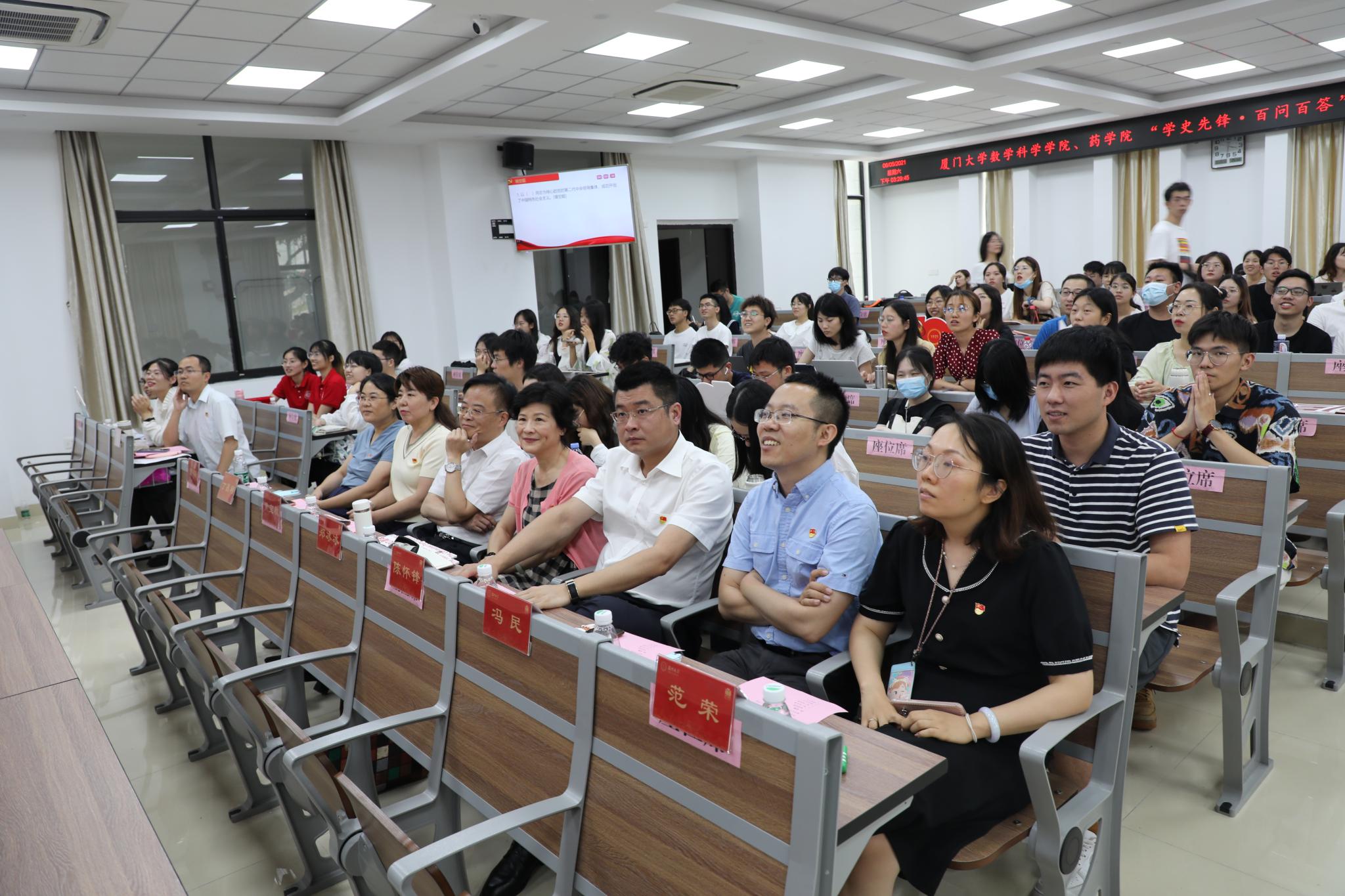 6月5日下午,数学科学学院与药学院在海韵园实验楼106报告厅联合举办“学史先锋·百问百答”党史知识竞赛。校党建巡察员、党史学习教育指导组第四组组长、数学科学学院党建联络员郑冰冰,数学科学学院党委书记黄宝秋,药学院党委书记陈怀锋,数学科学学院党委副书记丁昌利、党务秘书曹璐,药学院党务秘书冯民,数学科学学院团委书记于正伟、团委副书记陈淑铌,药学院团委副书记范荣出席本次活动。活动由数学科学学院硕士基础数学党支部刘畅、药学院本科生党支部郭妙婷主持。