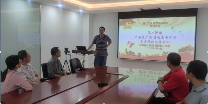 6月8日,数学科学学院教师第一党支部和第三党支部在天元中心会议室联合开展“固定党日+”活动,集中学习《中国共产党普通高等学校基层组织工作条例》。