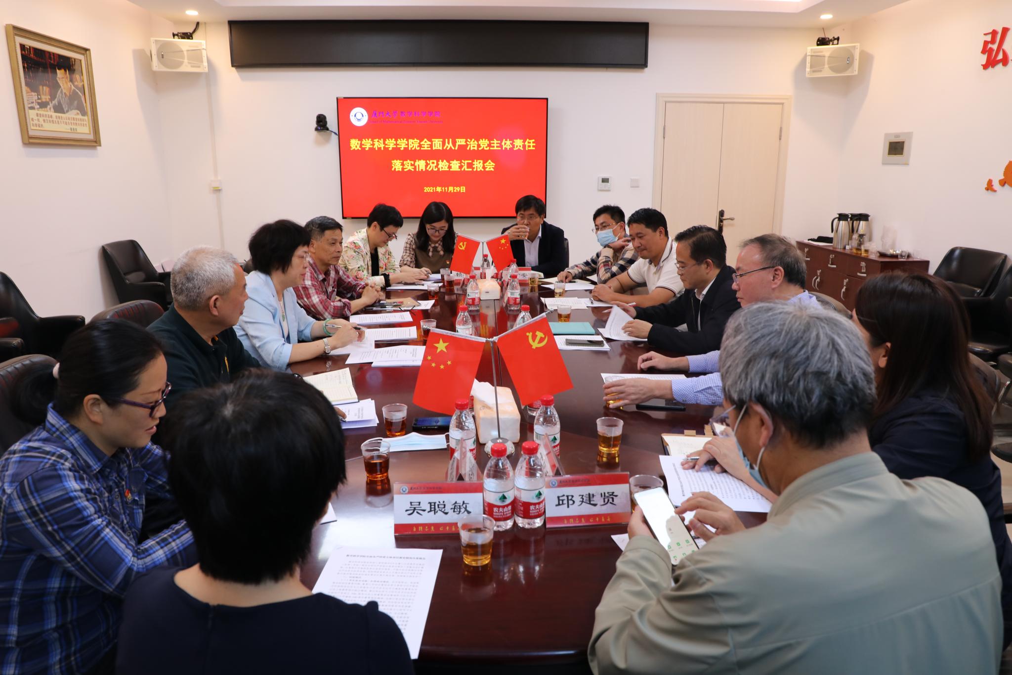 检查组首先听取学院党委2021年履行全面从严治党主体责任情况的汇报。黄宝秋代表党委班子对照《数学科学学院党委全面从严治党主体责任清单》作逐项检查,详细汇报学院压实管党治党责任、落实从严治党举措的具体进展,也对学院履行全面从严治党主体责任中存在的不足和下一步改进思路作出说明。随后,检查组分组开展个别谈话,与师生党员深入座谈交流,现场查阅相关材料。