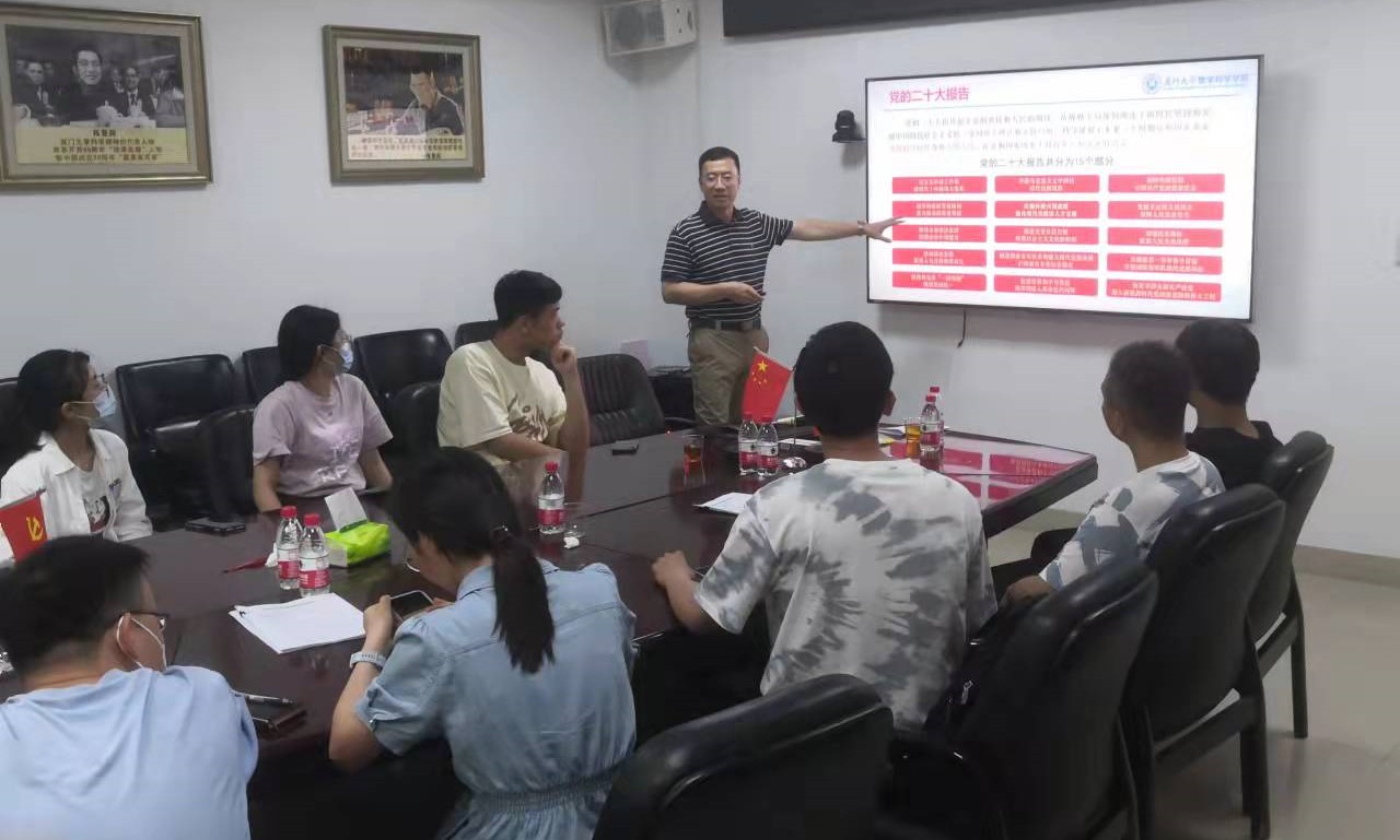朱玉峻结合自身学习体会,从学院的实际工作和当前数学学科的实际情况出发,带领党员们深刻领会习近平新时代中国特色社会主义思想的核心要义、精神实质和丰富内涵、实践要求。他简要介绍了学院深入学习贯彻党的二十大精神,在加强师资建设队伍、建设一流本科专业、高水平建设国家天元数学东南中心等方面取得的初步成效,并提出,青年学生正处于世界观、人生观、价值观形成的关键阶段,也是吸收新知识、打牢专业基础的重要时期,要把握好习近平新时代中国特色社会主义思想的世界观和方法论,坚持好、运用好贯穿其中的立场观点方法,争做有理想、有本领、有担当的新时代中国青年,为实现中华民族伟大复兴的中国梦贡献智慧和力量。