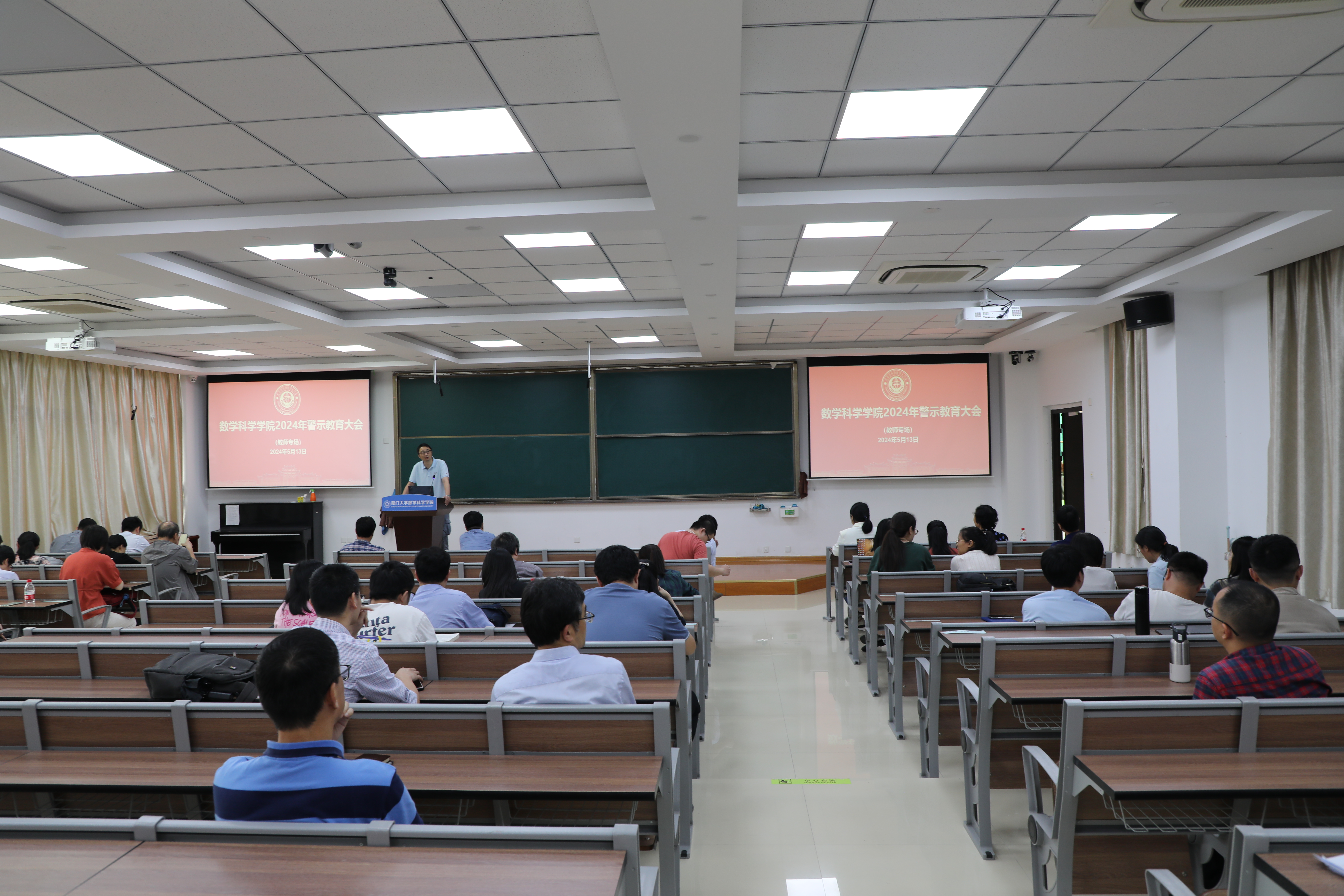 为一体推进党风、师德师风、校风学风建设,营造积极健康、干事创业的政治生态和育人环境,5月13日,数学科学学院分别在实验楼106报告厅和实验楼206报告厅召开2024年度警示教育大会,深刻剖析违纪典型案例,强化警示震慑,推动党纪学习教育走深走实。大会分教师党员和学生党员两个专场进行。