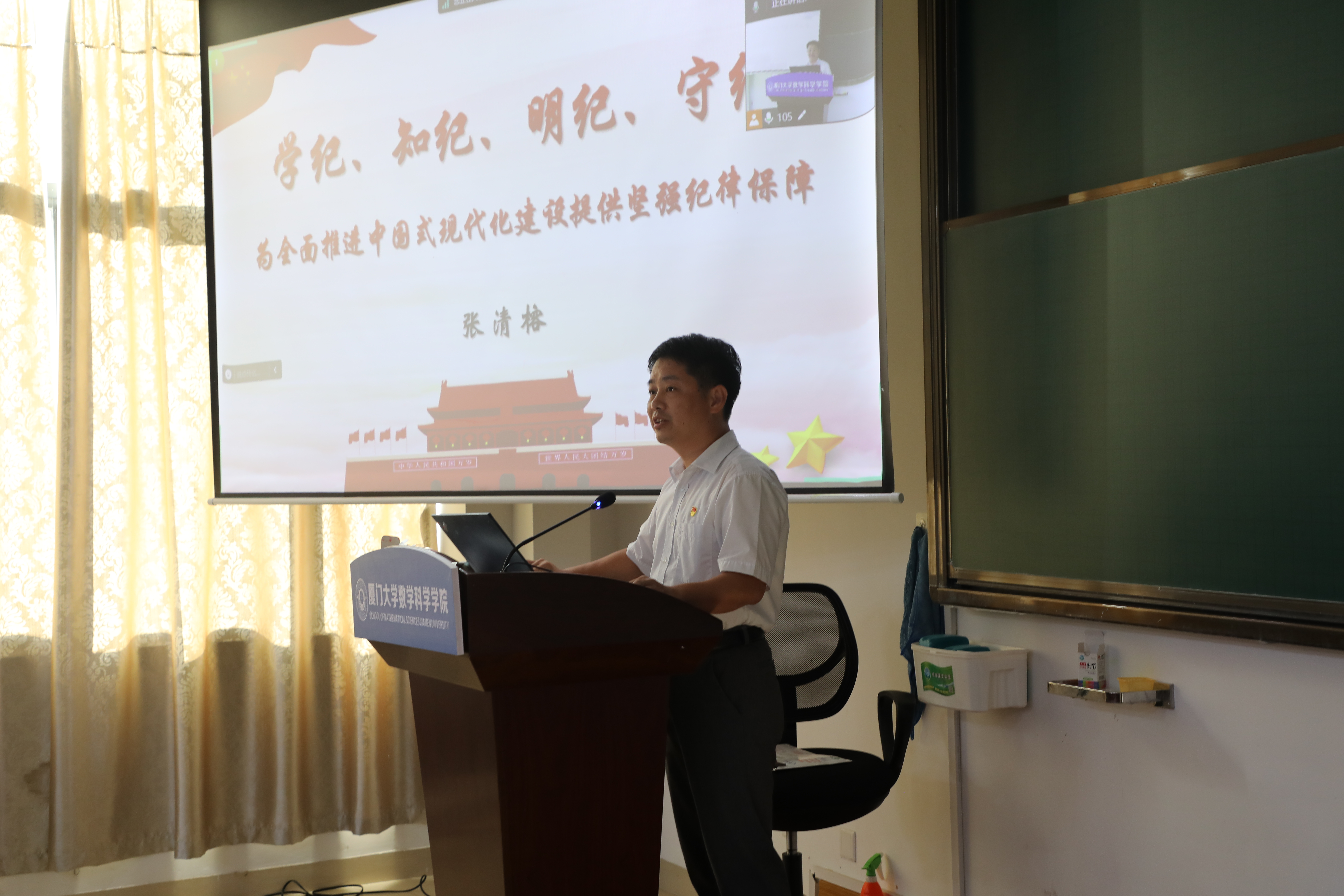 6月20日下午,数学科学学院举办党纪学习教育专题党课,学院党委书记张清榕为全院师生党员作题为《学纪、知纪、明纪、守纪 为全面推进中国式现代化建设提供坚强纪律保障》的报告。党课主会场设在海韵实验楼105报告厅,同时在海韵实验楼206报告厅设视频直播分会场,共计273名党员听取党课,学校基层党建工作联络员郑冰冰和部分在外地出差、实习的师生通过线上参加。